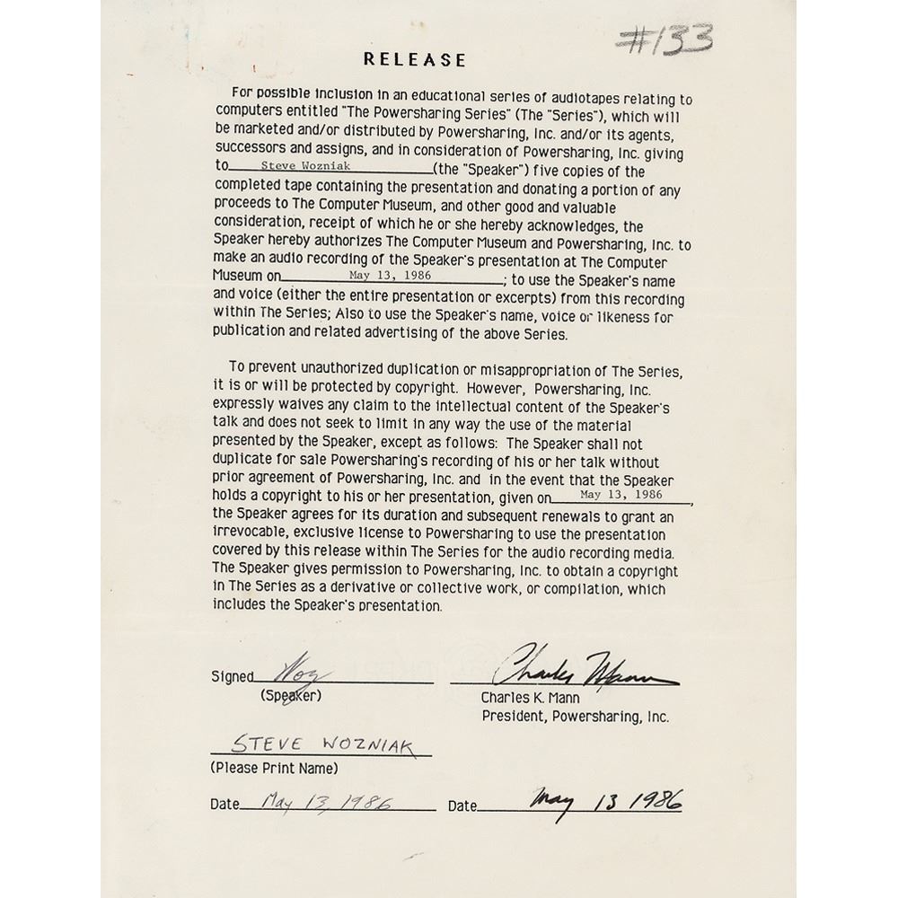 DS, signed in cursive, “Woz,†and in print, "Steve Wozniak," one page, 8.5 x 11, May 13, 1986. Wozniak consents to the release of his lecture, 'The Making of an Engineer and a Computer,' given at The Computer Museum in Boston on May 13, 1986, as part of Charles Mann's "educational series of audiotapes relating to computers entitled 'The Powersharing Series.'" Signed at the conclusion in ballpoint by Wozniak, printing his name and writing the date below. Countersigned in ink by Mann. In fine condition.
