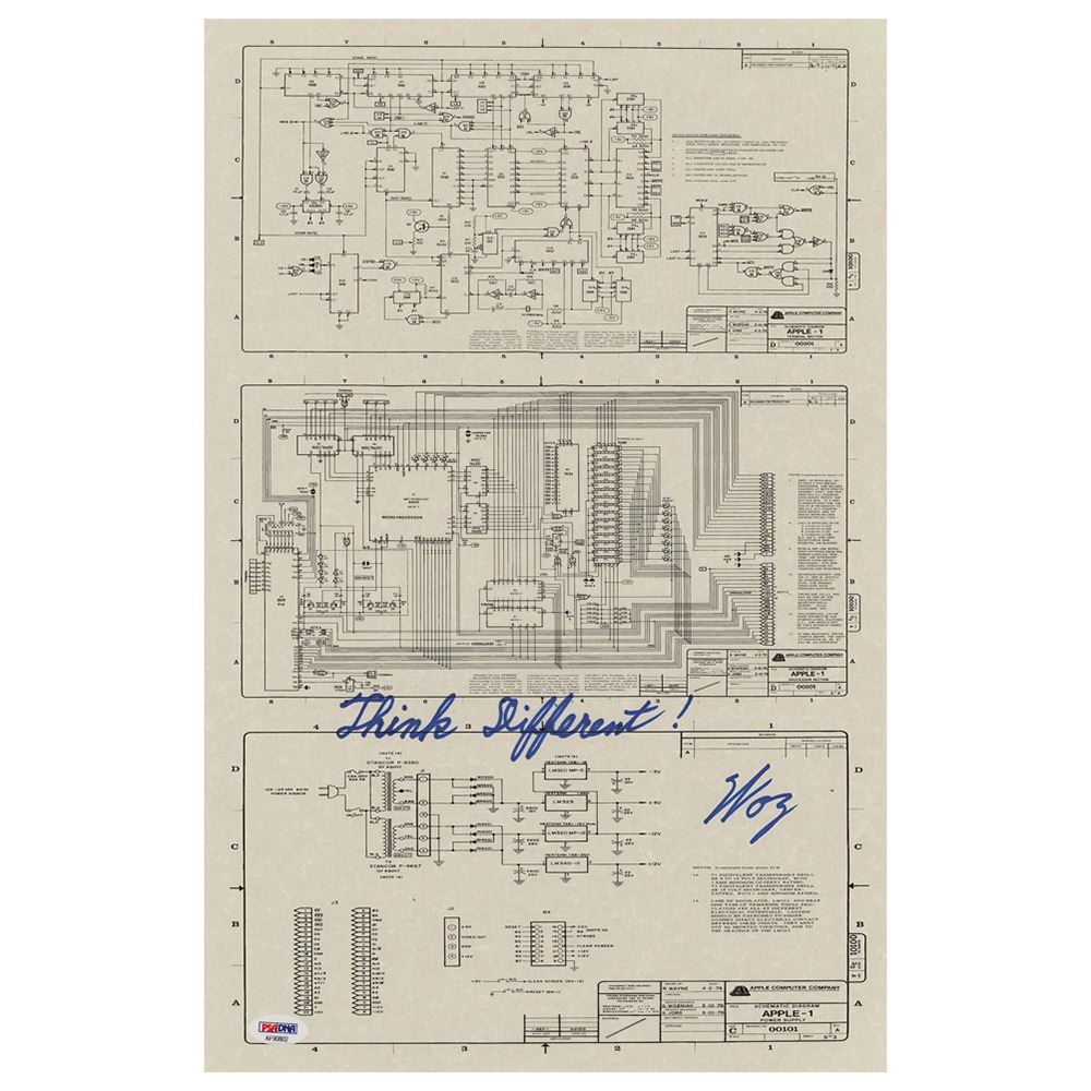 Printed reproduction of an Apple-1 ‘power supply’ schematic diagram, 11 x 17, signed in blue felt tip, “Think Different! Woz.†In fine condition, with a PSA/DNA label affixed to the lower left corner. Accompanied by a certificate of authenticity from PSA/DNA.