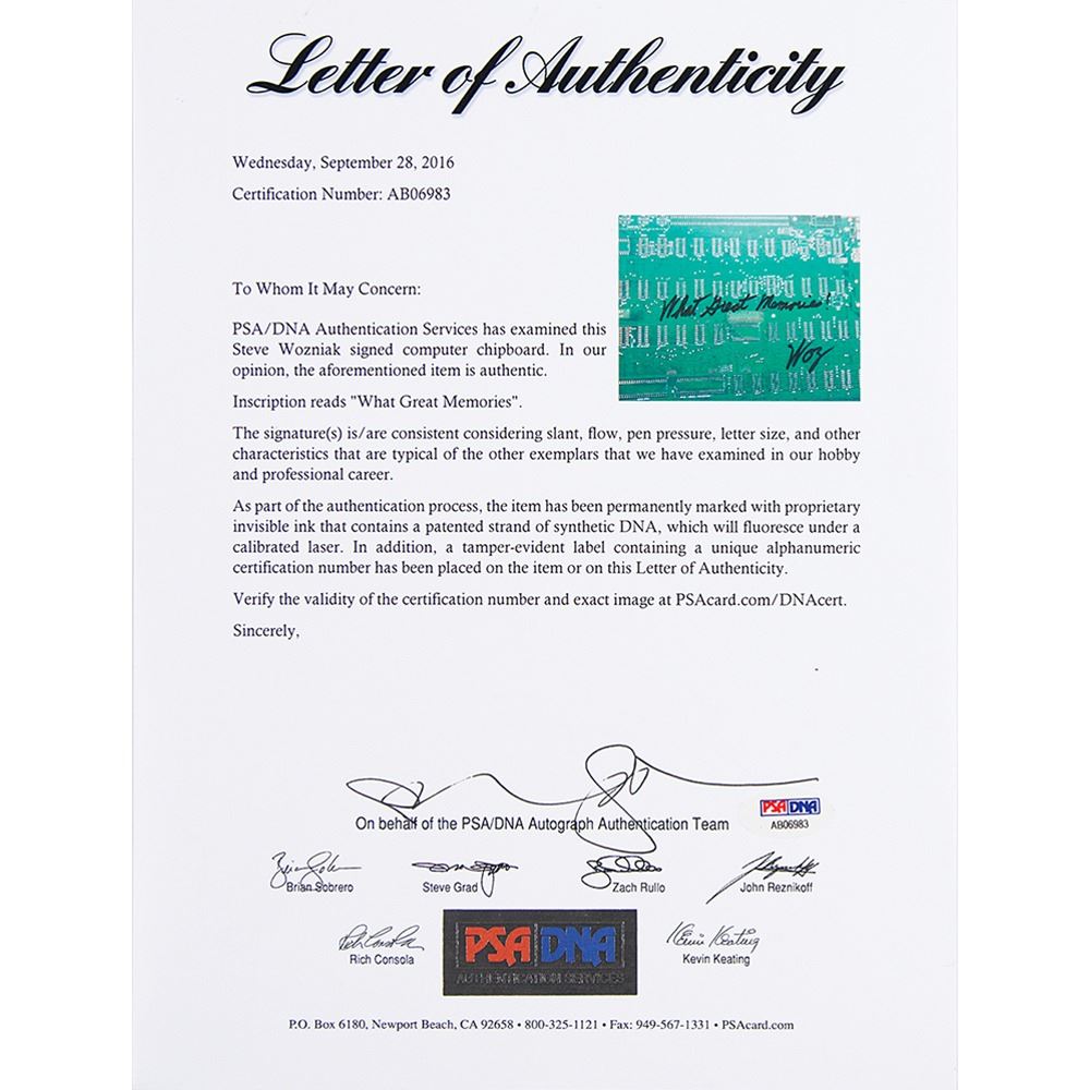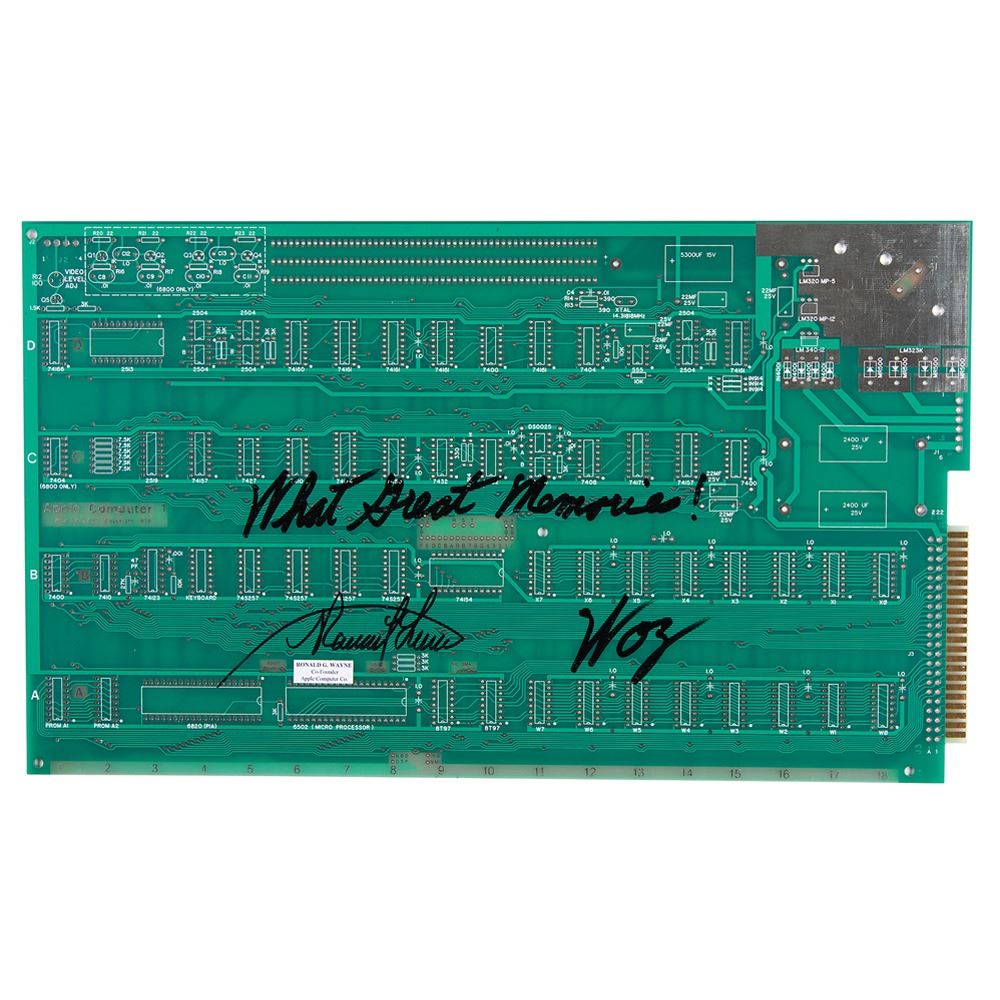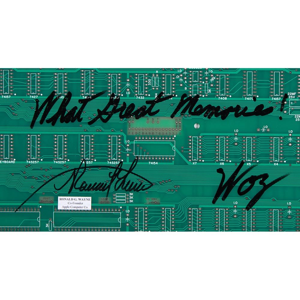 Desirable replica of the Apple-1 Computer circuit board, 15.5 x 9.25, signed in black felt tip by two of Apple's co-founders, "What Great Memories! Woz," and "Ronald G. Wayne." A small identification label is applied below Wayne's signature. In very fine condition. Accompanied by a full letter of authenticity from PSA/DNA for Steve Wozniak's autograph.