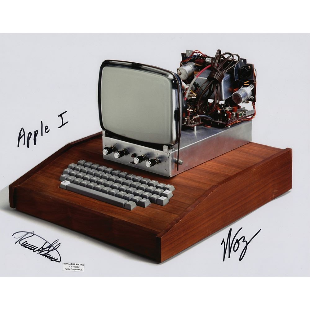 Color satin-finish 14 x 11 photo of the Apple-1 computer, signed in black felt tip signed in black felt tip by two of Apple's co-founders" Steve Wozniak, "Apple I, Woz," and Ron Wayne, "Ronald Wayne," signing over his embossed personal seal. In fine condition.
