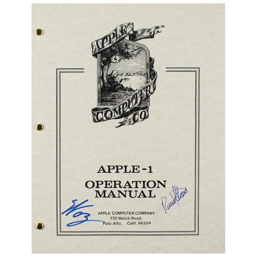 Brad-bound facsimile of the original Apple-1 operation manual, 8.5 x 11, 12 pages, signed on the front cover in blue felt tip by Apple- co-founders Steve Wozniak ("Woz") and Ron Wayne ("Ronald Wayne"). In very fine condition. Accompanied by a certificate of authenticity from PSA/DNA.
