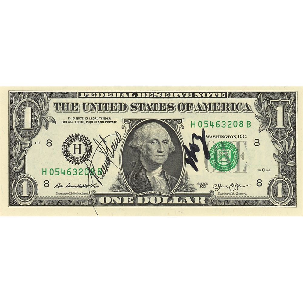 Series 2017 one-dollar bill signed in black ink and felt tip by Apple co-founders Steve Wozniak (“Wozâ€) and Ron Wayne (“Ronald Wayneâ€), the latter signing over his embossed personal seal. In very fine condition.