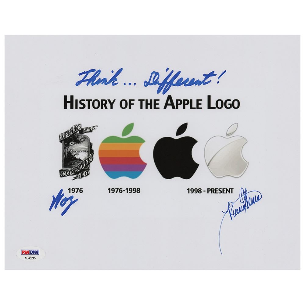Color satin-finish 10 x 8 photo showing the "History of the Apple Logo," signed in blue felt tip, "Think Different! Woz" and "Ronald Wayne." In very fine condition, with a PSA/DNA label affixed to lower left corner (certificate not present).