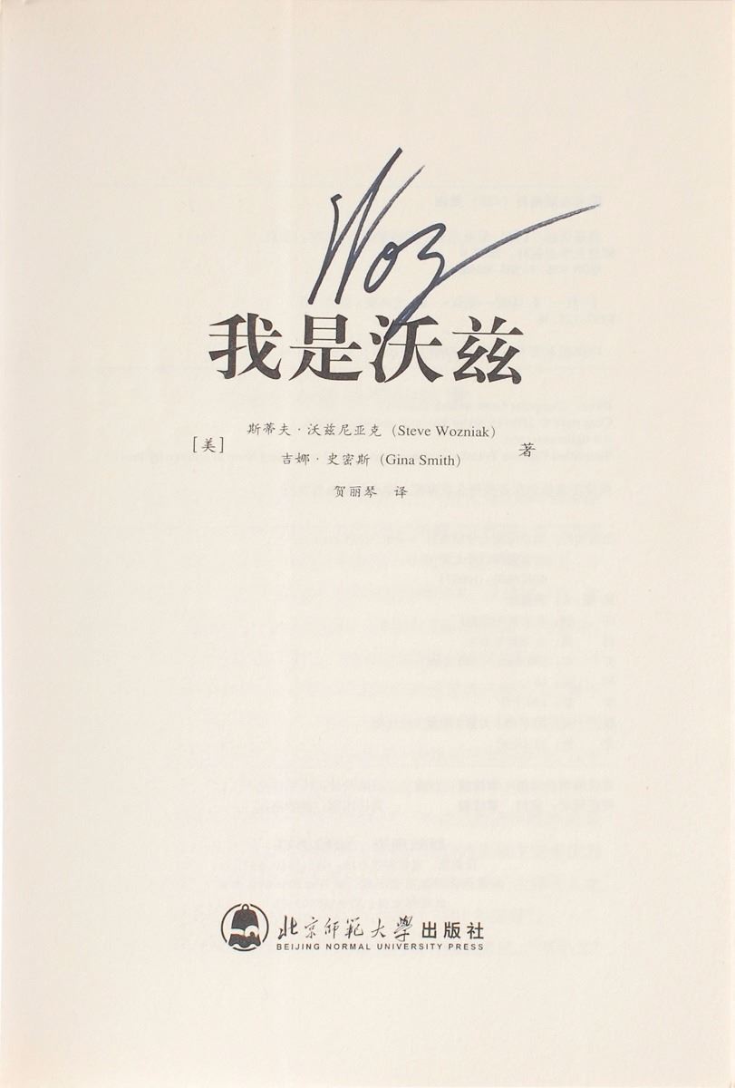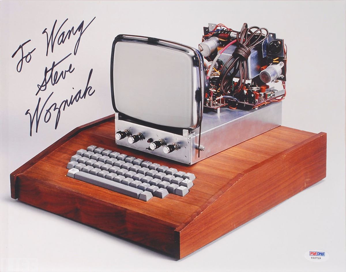 Two items: a color satin-finish 14 x 11 photo of the Apple I computer, signed and inscribed in black felt tip, “To Wang, Steve Wozniak”; and a softcover Chinese edition of iWoz, signed on the title page in black felt tip, “Woz.” In overall fine condition, with a PSA/DNA label affixed to the corner of the photo. Accompanied by a certificate of authenticity from PSA/DNA for the signed photo.