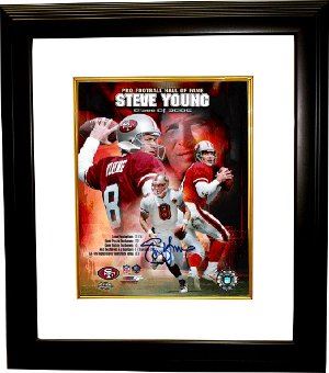 Steve Young was named the Most Valuable Player of the NFL in 1992 and in 1994, the MVP of Super Bowl XXIX, and was inducted into the Pro Football Hall of Fame in 2005, the first left-handed quarterback to be so honored. He holds the NFL record for highest career passer rating and won six NFL passing titles. Steve Young has hand autographed this San Francisco 49ers HOF Collage 16x20 Color Photo. Custom White Mat and Black Color Framed as shown. GTSM/Young Hologram and Certificate of Authenticity from Athlon Sports. Inducted August 7th, 2005 into Pro Football Hall of Fame.