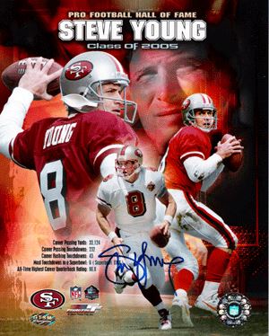 Steve Young was named the Most Valuable Player of the NFL in 1992 and in 1994, the MVP of Super Bowl XXIX, and was inducted into the Pro Football Hall of Fame in 2005, the first left-handed quarterback to be so honored. He holds the NFL record for highest career passer rating and won six NFL passing titles. Steve Young has hand autographed this San Francisco 49ers HOF Collage 16x20 Color Photo. GTSM/Young Hologram and Certificate of Authenticity from Athlon Sports. Inducted August 7th, 2005 into Pro Football Hall of Fame.
