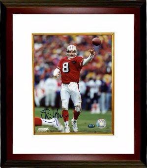 Steve Young was named the Most Valuable Player of the NFL in 1992 and in 1994, the MVP of Super Bowl XXIX, and was inducted into the Pro Football Hall of Fame in 2005, the first left-handed quarterback to be so honored. He holds the NFL record for highest career passer rating and won six NFL passing titles. Steve Young has hand autographed this San Francisco 49ers 16x20 Color Photo. GTSM/Young Hologram and Certificate of Authenticity from Athlon Sports. Inducted August 7th, 2005 into Pro Football Hall of Fame. Custom White Mat and Premium Mahogany Frame as shown.