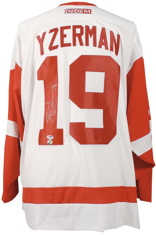 Official CCM replica Detroit Red Wings hockey jersey, with sewn on letters and numbers, signed in silver ink on the number on the back. In fine condition. Accompanied by a certificate of authenticity from PSA/DNA.