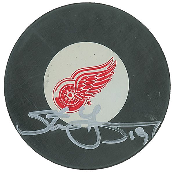Official NHL Detroit Red Wings hockey puck signed in silver ink the logo side. In fine condition, with a few light scuffs.