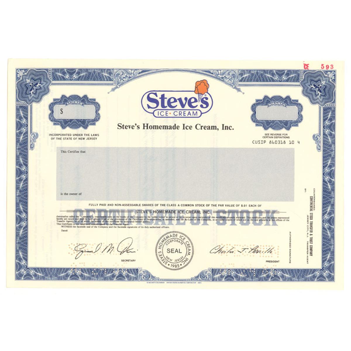 [SPECIMEN] ----, New Jersey. Stock certificate specimen in Steve’s Homemade Ice Cream, Inc. Blue / Black. Corporate logo at top center. Perforation cancellation at signatures. Very Fine.