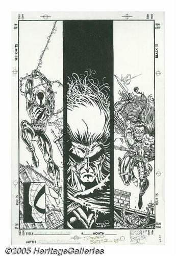 <B>Steven Butler - Web of Spider-Man #120 Cover Original Art (Marvel, 1995).</B></I> Steven Butler brings the Scarlet Spider, the mystery man called Kaine, and the Grim Hunter, together on a collision course with destiny, in this cover illustration from <B>Web of Spider-Man</B></I> #120. The image area measures 10" x 15" and the art is in Excellent condition. Signed by Steven Butler along the bottom.