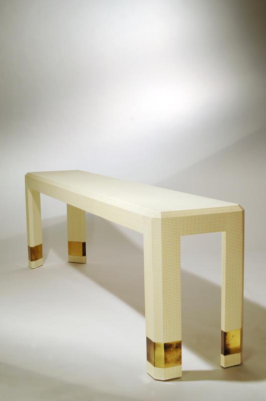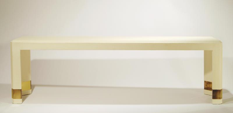 25h x 17w x 86d inches, off white painted wood, rattan, brass, original wonderful patina on the copper covers, small paint misses on the top, close to perfect condition