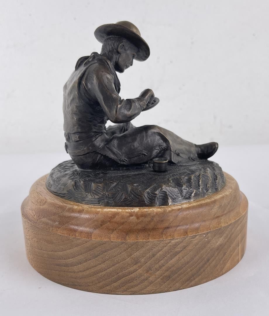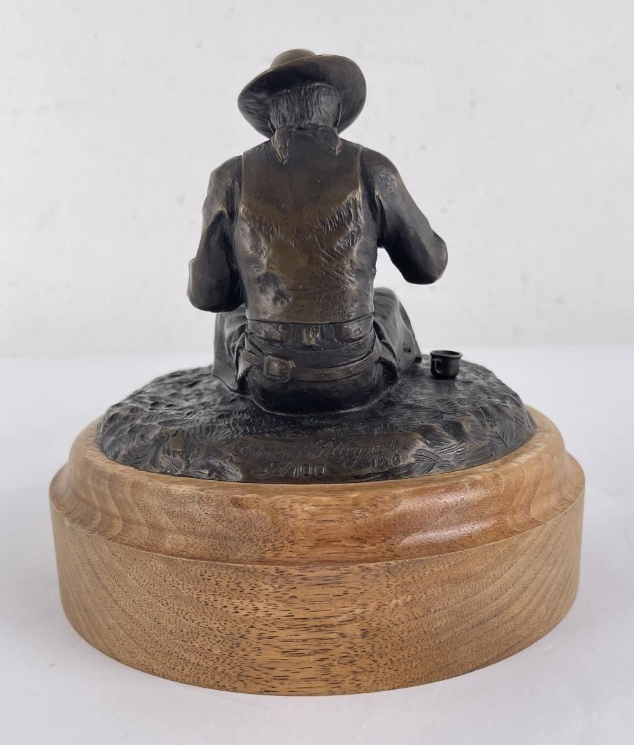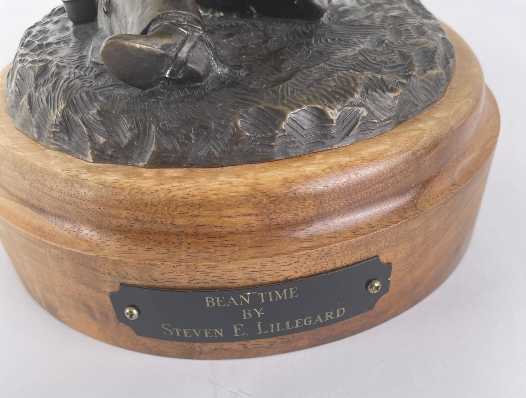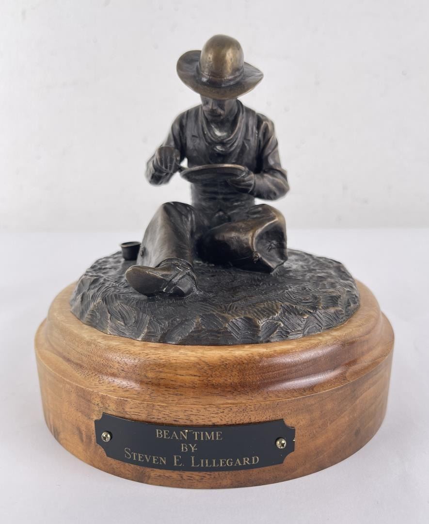 Title is Bean Time. 6 1/2" tall. Born in 1955, Steven E. Lillegard was raised on a ranch and in the small towns of Moccasin and Stanford in central Montana. His artistic ability was noticed and encouraged early by his mother, Elisabeth Lillegard, an artist trained in Boston. During family trips to New England she took him to see works of masters in museums in Boston, Washington D.C. and New York City. His formal training started at Stanford High School where Patricia Hansen assembled an excellent art department. He continued his education at Montana State University where he majored in Fine Art. He won awards in illustration and cartooning while working as the artist for the university newspaper. Lillegard transferred to a graphic arts college and worked as a graphic artist before turning his attention to sculpture. He returned to Stanford in 1981 and began researching the process of casting bronze and built his foundry. Since then his sculptures have won numerous awards including "Best of Show" and "Peoples Choice". They have been featured in museums and can be found in collections worldwide.