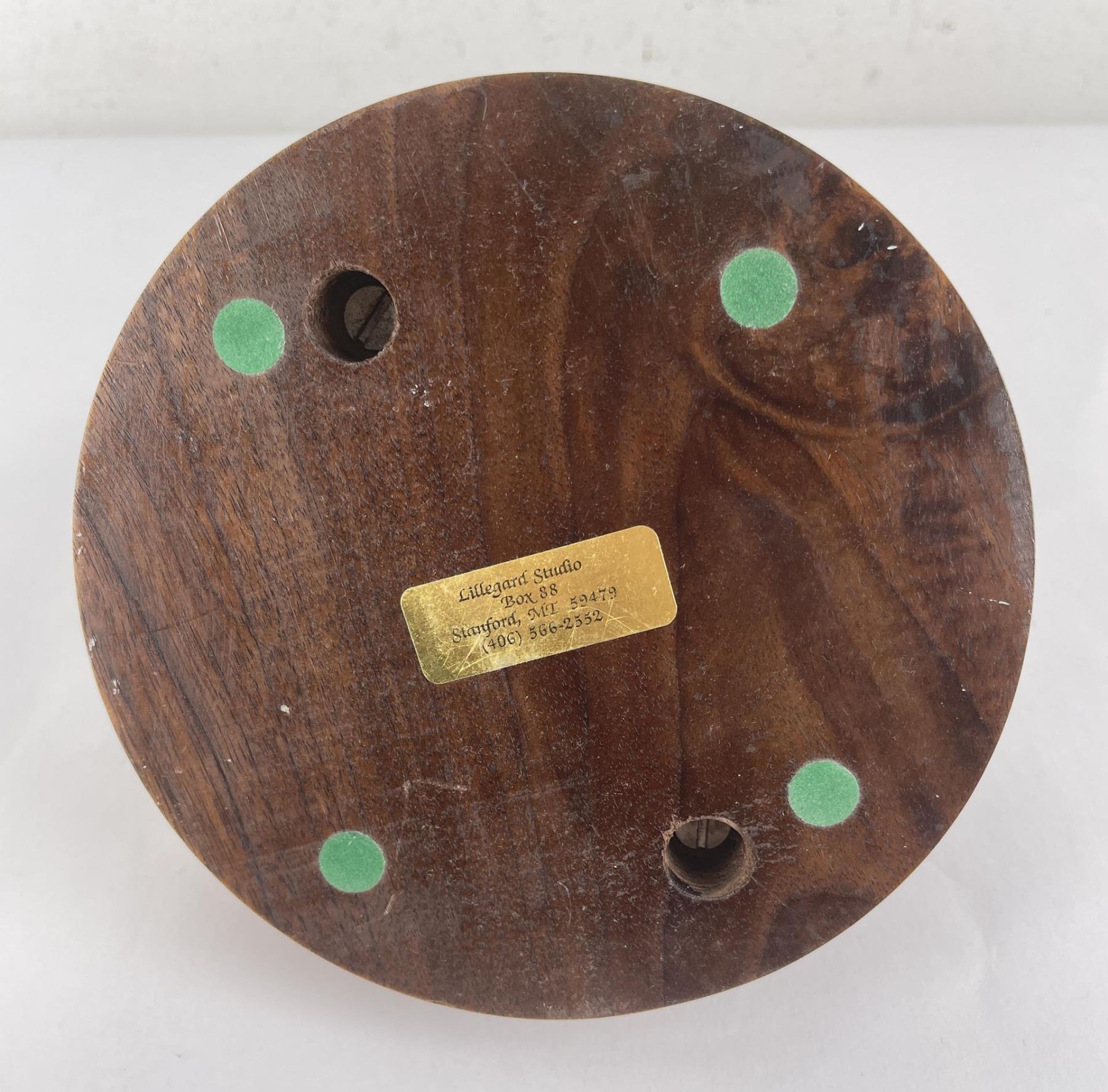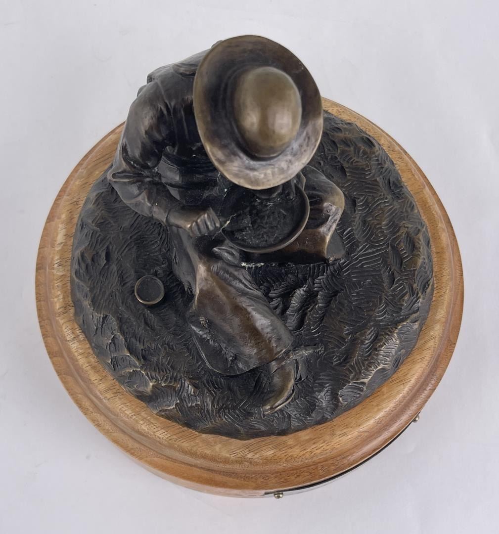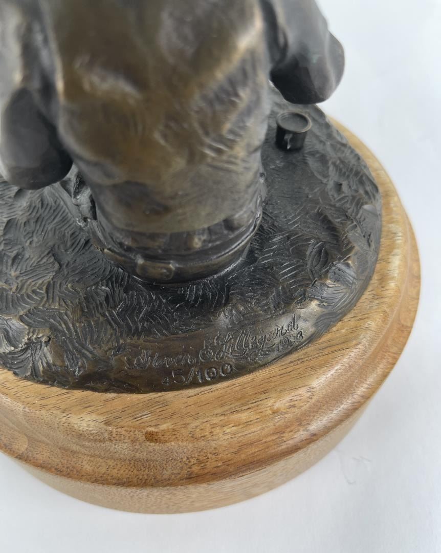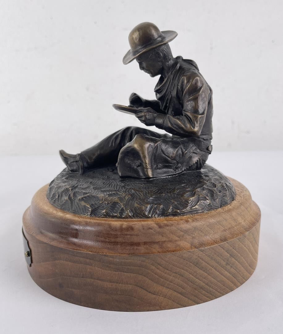 Title is Bean Time. 6 1/2" tall. Born in 1955, Steven E. Lillegard was raised on a ranch and in the small towns of Moccasin and Stanford in central Montana. His artistic ability was noticed and encouraged early by his mother, Elisabeth Lillegard, an artist trained in Boston. During family trips to New England she took him to see works of masters in museums in Boston, Washington D.C. and New York City. His formal training started at Stanford High School where Patricia Hansen assembled an excellent art department. He continued his education at Montana State University where he majored in Fine Art. He won awards in illustration and cartooning while working as the artist for the university newspaper. Lillegard transferred to a graphic arts college and worked as a graphic artist before turning his attention to sculpture. He returned to Stanford in 1981 and began researching the process of casting bronze and built his foundry. Since then his sculptures have won numerous awards including "Best of Show" and "Peoples Choice". They have been featured in museums and can be found in collections worldwide.