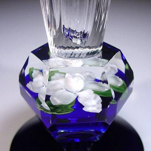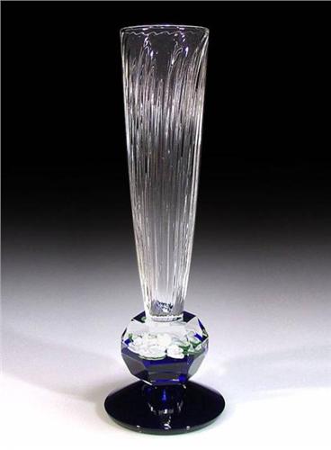 Steven Lundberg & Steve Ledterman one-of-a-kind collaborative bud vase. Spiraled clear flute, white gardenia on blue ground faceted paperweight center over cobalt base. Cut, polished, and reassembled by Ledterman. Signed by both artists. Height 10 1/4" Diameter of base 2 3/8". Donated by: Steve Ledterman.<p>Proceeds from the auction will go to benefit Santa Cruz, California glass artist Steven Lundberg, who, after 30 years of blowing glass locally, was diagnosed with amyotrophic lateral sclerosis, or ALS (Lou Gehrig's disease). This auction is a fundraising effort to help Steve meet the challenges of this disease.<p>Costs of treating ALS over a period of time can be exorbitant. In the short-term, Steve needs basic equipment such as an electric scooter and pointing devices to help him read and write.<p>Please join us for this auction, and help support a friend. Check out our other auctions to see the 150 paperweights, vessels, and glass sculptures from internationally known glass artists, donated by generous artists, galleries, and glass collectors from all over the country. Please contact us at 1-800-538-0766 or (831) 427-1177 for more information, or see <a href=http://www.selman.com/press target=_blank>www.selman.com/press</a>.