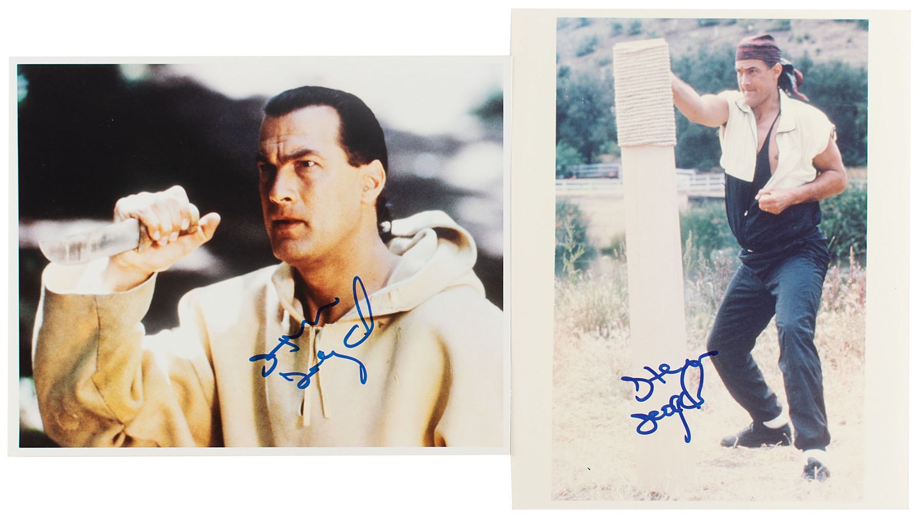 Two color glossy photos of Seagal in action roles, 8 x 10 and 10 x 8, each signed in blue felt tip. In overall fine condition. Originally obtained by in-person specialist Mike Wehrmann.
