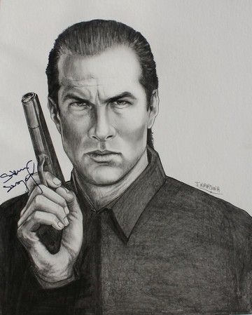 Black and white pencil drawing of Steven Segal, signed by the actor in blue felt pen. Drawing is by Joseph Namsinh. Segal signed at the premiere of Under Seige 2 in 1995. Measures 16 x 20.