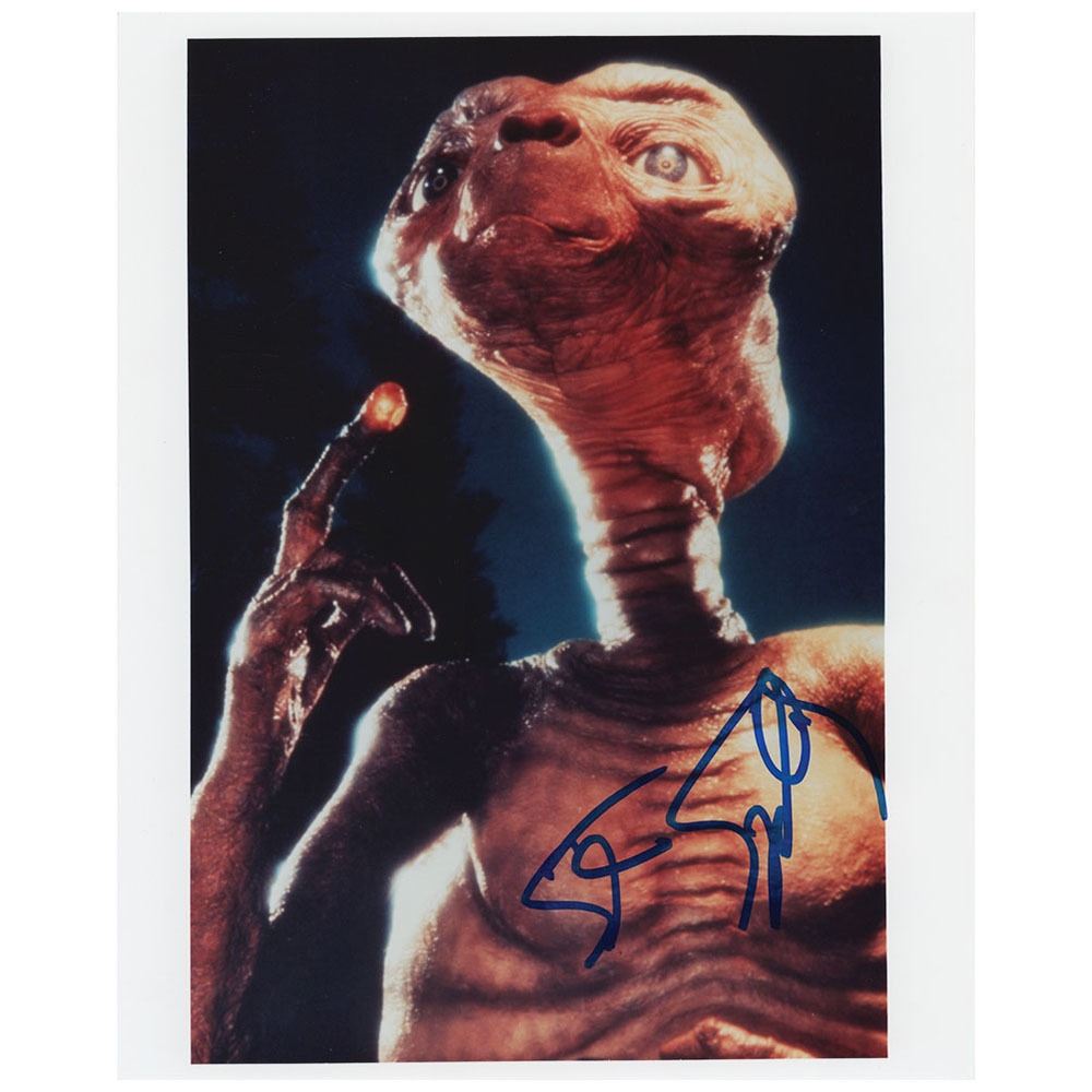 Color glossy 8 x 10 photo of the titular star of the family sci-fi classic E.T., the Extra-Terrestrial, signed in blue felt tip by Steven Spielberg. In very fine condition.