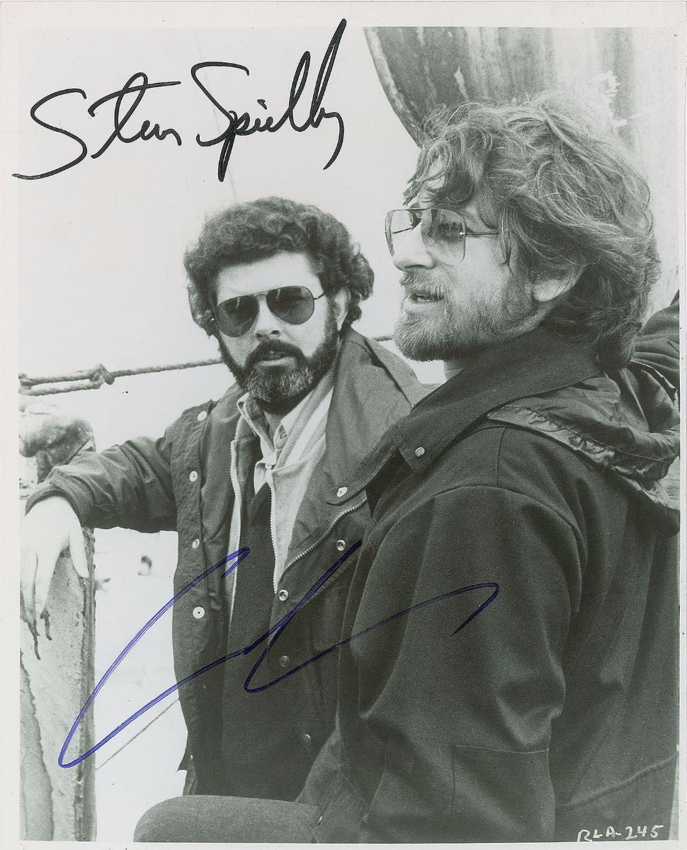 Glossy 8 x 9.75 photo of Steven Spielberg and George Lucas on set, signed in black felt tip by Spielberg and in blue felt tip by Lucas. Collector’s notations on reverse indicate that the signatures were obtained in person. In very good to fine condition, with a bend through the Spielberg signature and scattered creasing.