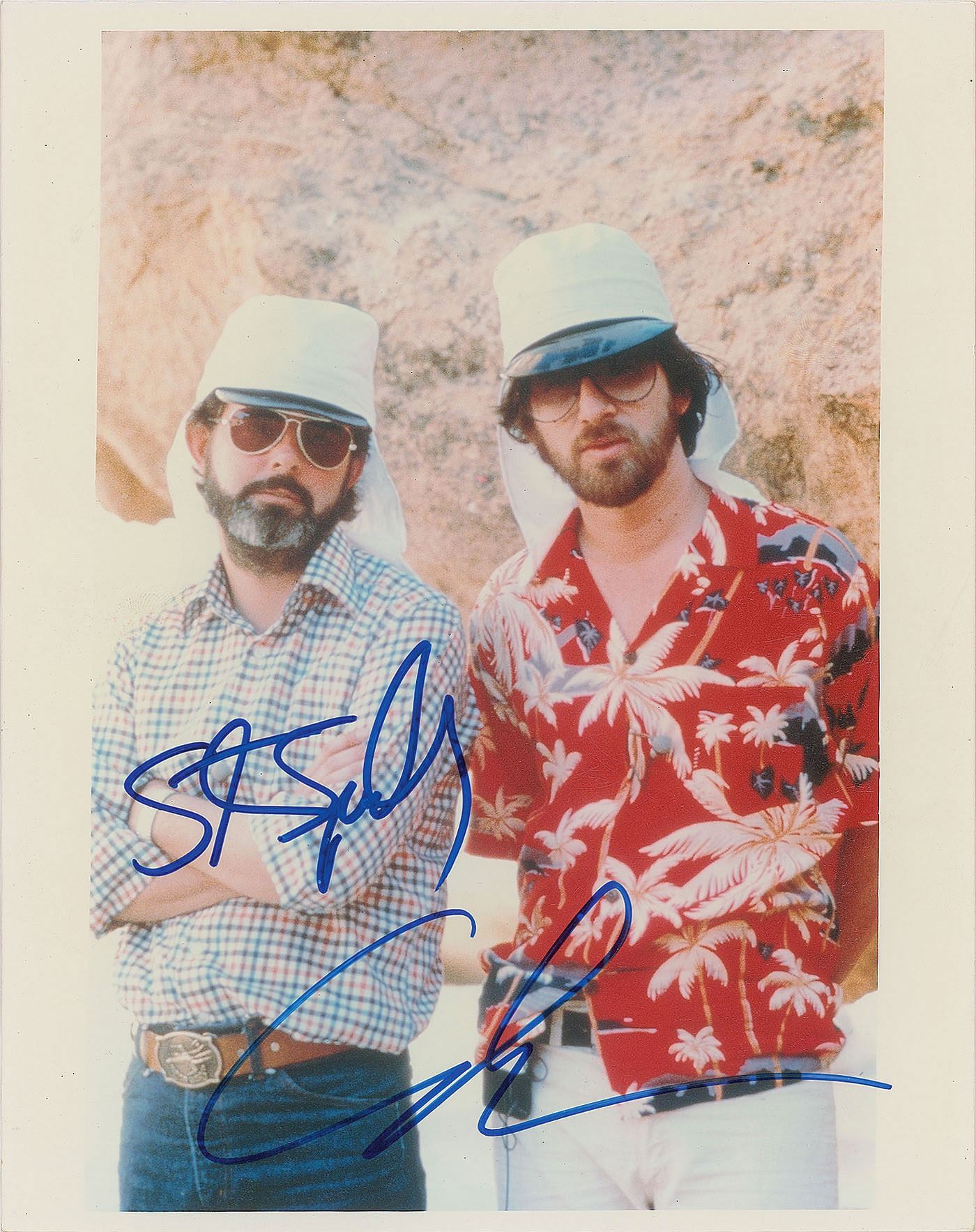 Color glossy 8 x 10 photo of George Lucas and Steven Spielberg posing on the set of the 1981 Indiana Jones adventure film Raiders of the Lost Ark, signed by both in blue felt tip. In fine condition.