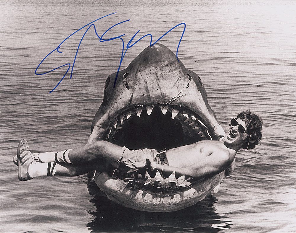 Satin-finish 14 x 11 photo of Spielberg relaxing in the mechanical shark from Jaws, signed in blue felt tip. In very fine condition.