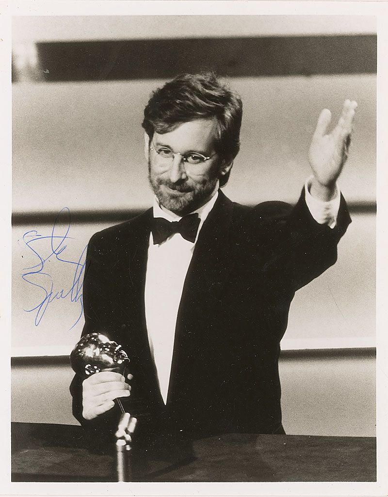 Glossy 8 x 10 photo of Spielberg acknowledging an audience at an awards ceremony, signed in blue ballpoint. In fine condition.