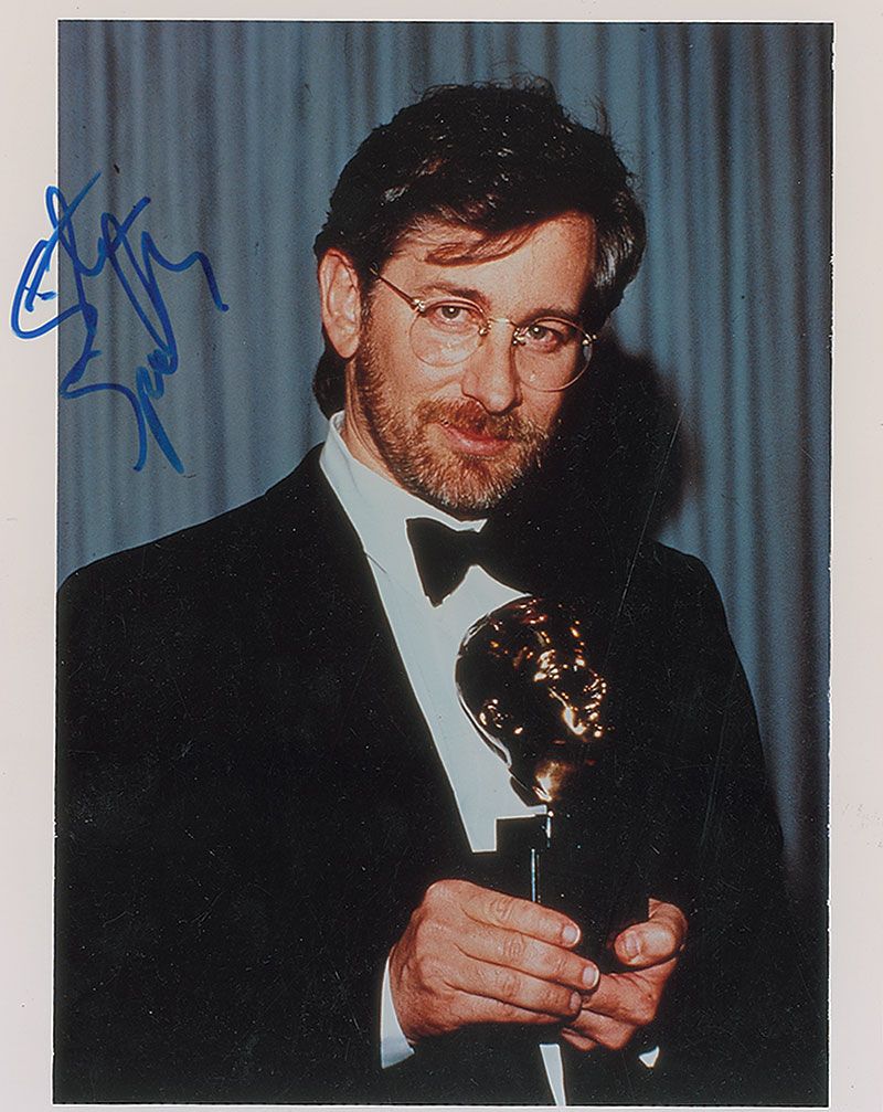 Color glossy 8 x 10 photo of Spielberg holding one of his many awards, signed in blue felt tip. In fine condition. Originally obtained in person by NYC collector Blake Levine.