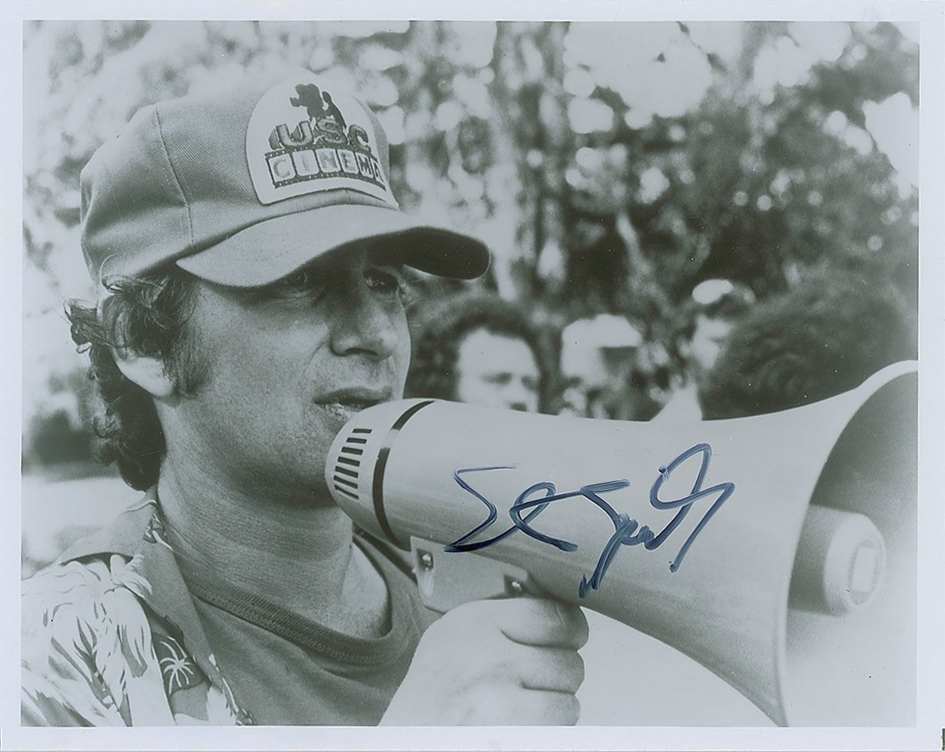 Glossy 10 x 8 photo of Spielberg directing via megaphone on the set of E.T., signed in black felt tip. In very fine condition.