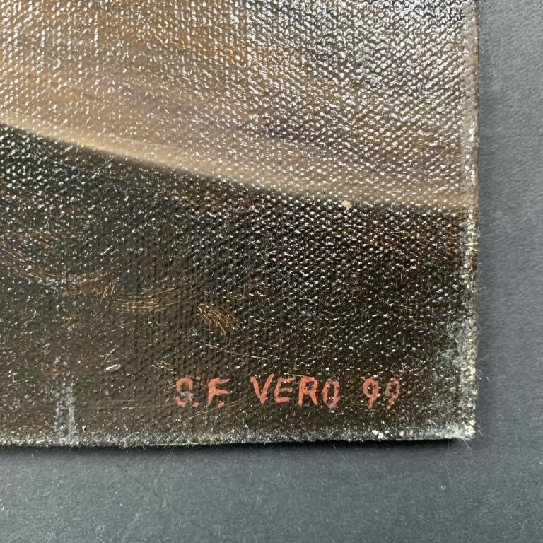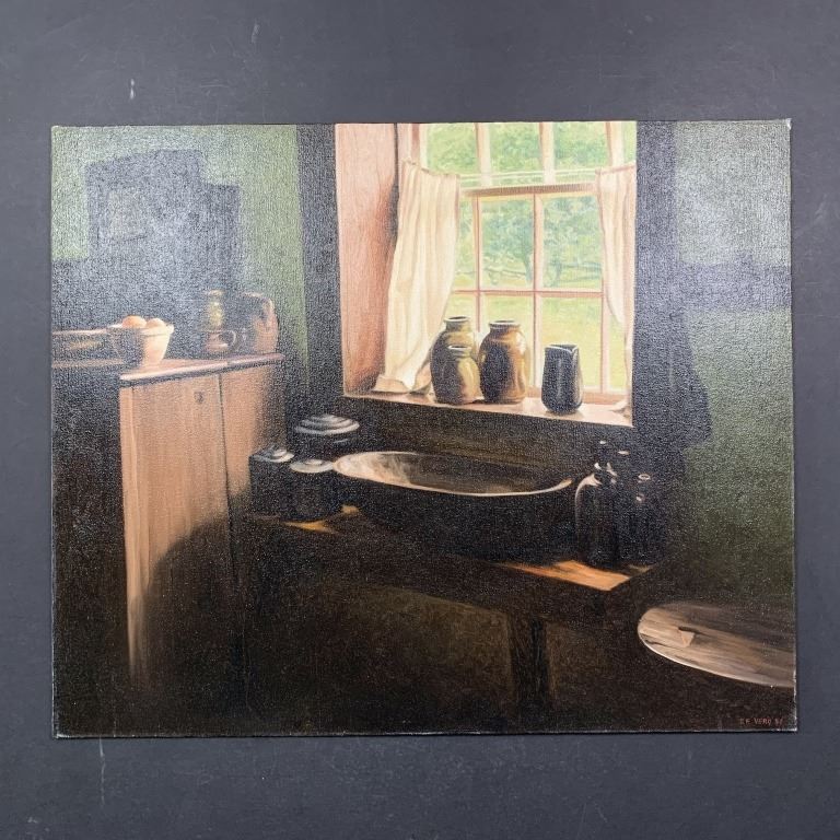 Steven Vero's "Interior Still Life" original acrylic on canvas board painting, circa 1999, signed and dated lower right. This piece is of a scene from inside a kitchen, looking out a window with a few jugs on the window sill. This piece is in excellent condition.