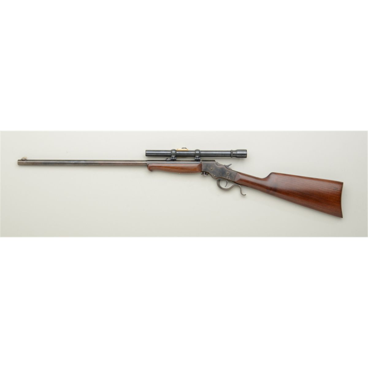 Stevens .22 LR caliber falling block rifle mounted with old J. C. Higgins scope, showing old refinish of which 50% remains. Good action, bright bore. Estimate: $150 - $300