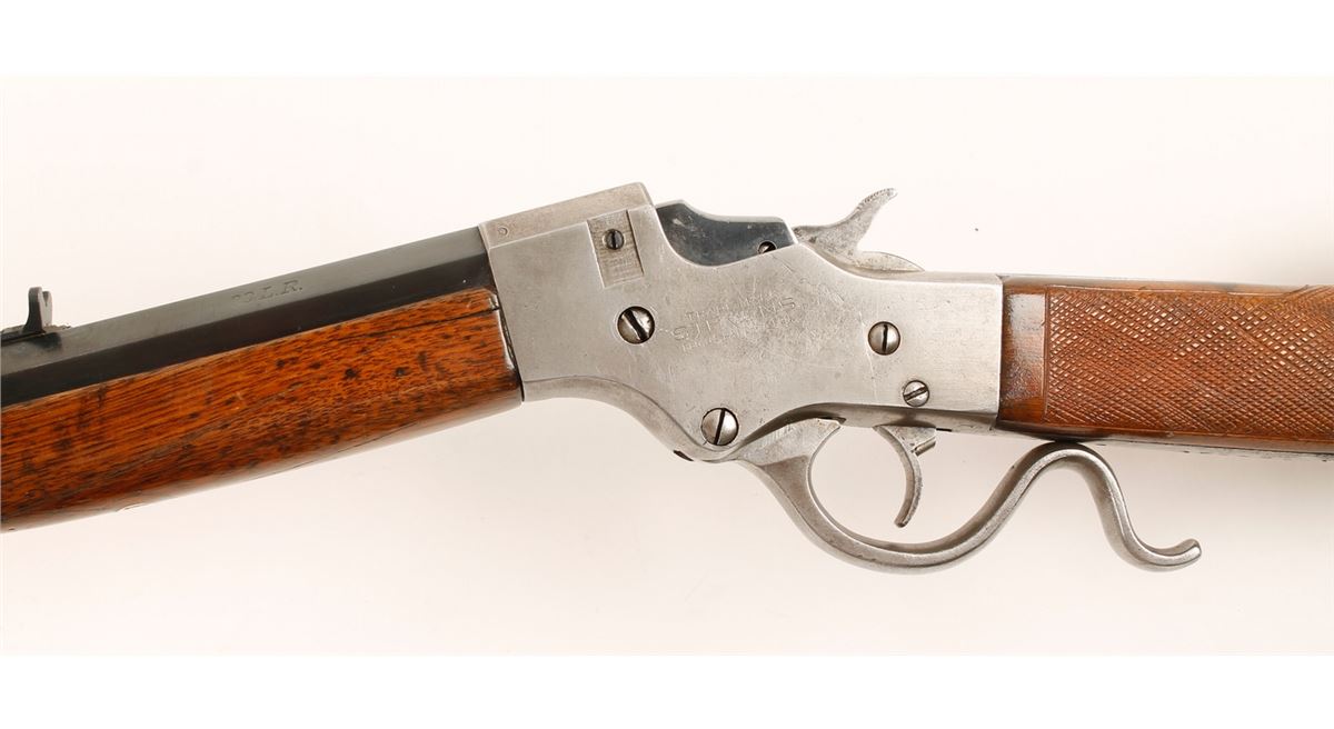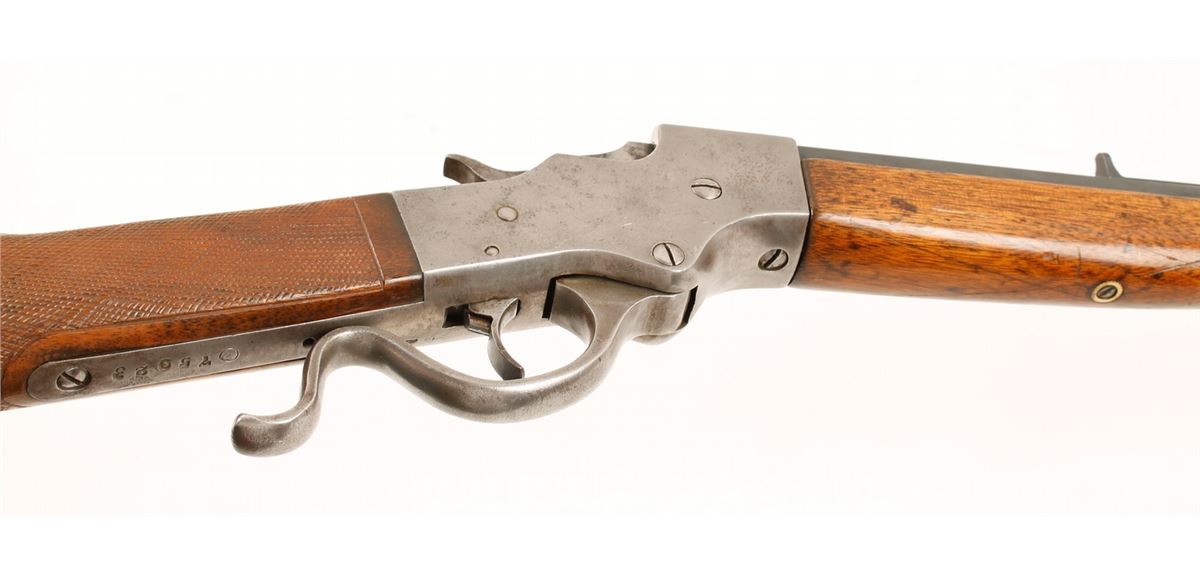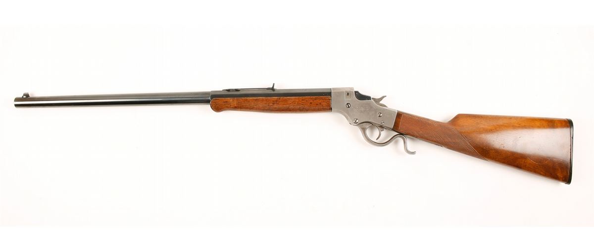 Single-shot drop-block lever operated rifle with a 23-1/4" half-round, half-octagon bull barrel and wood furniture. Blued barrel is number 65730 and is stamped  Stevens. The muzzle has a recessed flat crown. Bluing is in good condition with a few scrapes and edge wear. Receiver, lever, hammer and trigger are worn to in-the-white state with light pin prick pitting and rust stains. Plastic or hard rubber butt plate has a few marks. Wood  butt stock has rough checkering with some rubs, dings, scrapes and scratches. Schnabel forend has cracks at the tip and the receiver with numerous scratches and scrapes. Bore is mirror bright with sharp rifling. Action is tight and smooth. Condition is good.