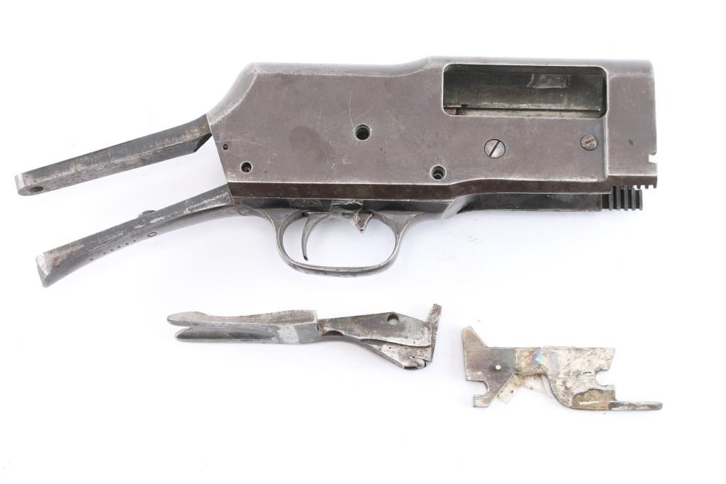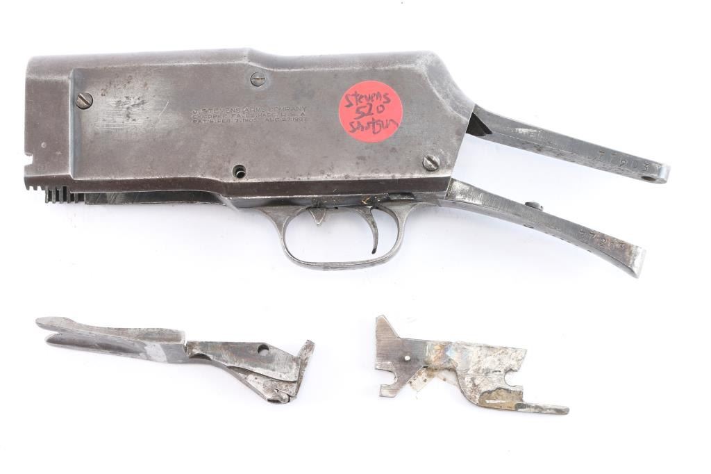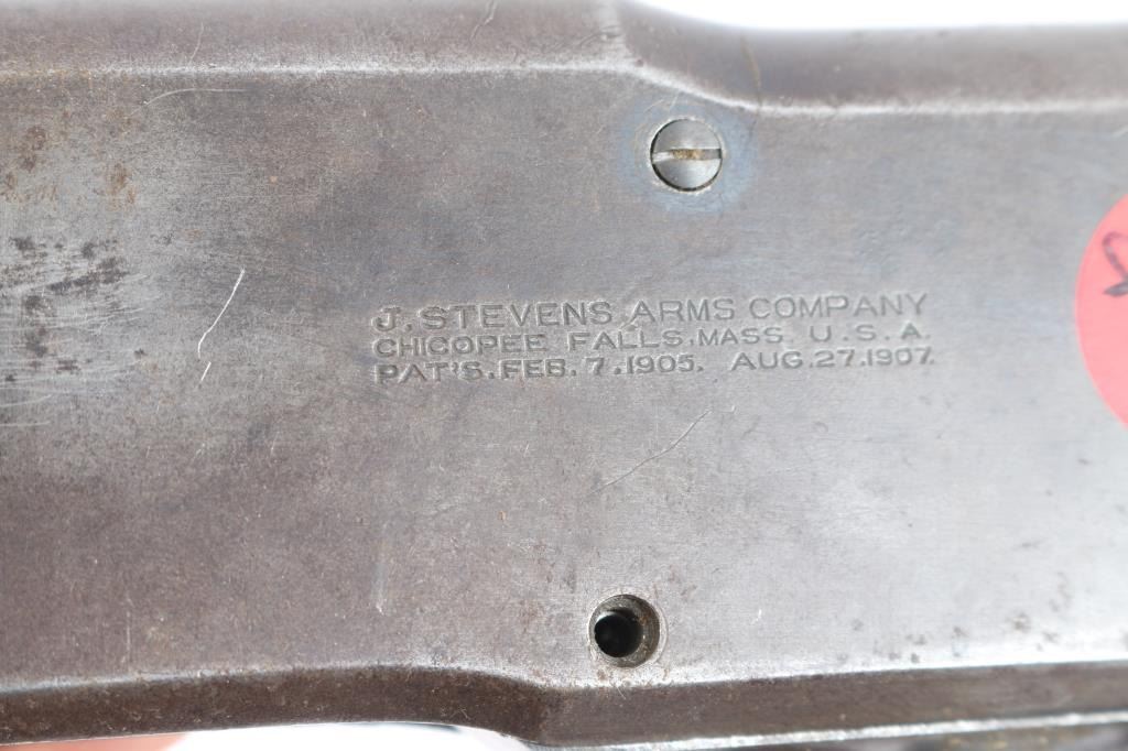 For parts or repair. A retro pump shotgun receiver designed by John Browning, and manufactured by J. Stevens and Tool Company between 1909 and 1916, and later New England Westinghouse/'J. Stevens Arms Company.' This particular receiver is marked 'J. Stevens Arms Company,' Chicopee Falls, MA. The original blued finish retained is approximately 35% with most of the bluing fading to a brown patina, and showing edge wear. Metal displays scattered spots of rust, pin prick pitting, and deformation in the screw slots. Receiver includes a smooth curved trigger and some on the internal parts.
