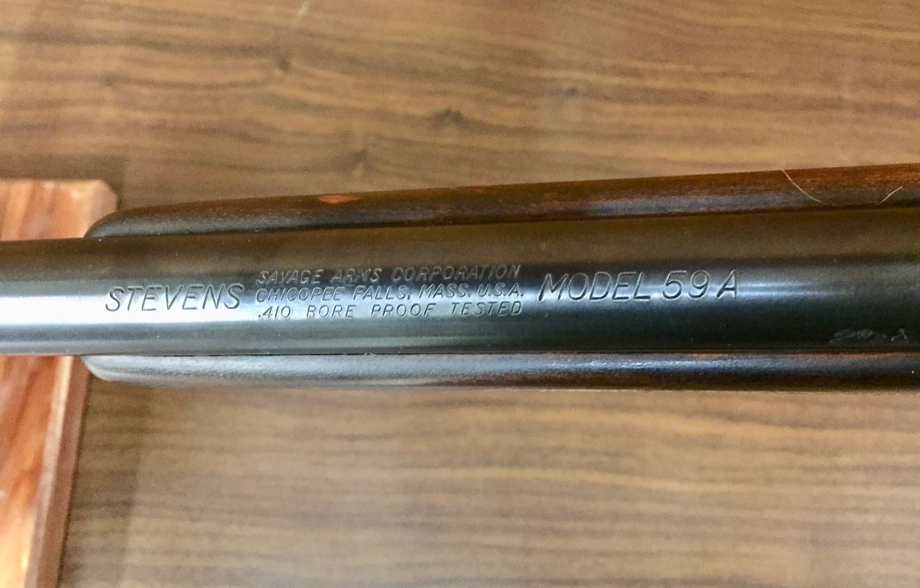Description: Presented for sale in this lot is a Stevens Model 59A, Bolt Action 410 shotgun made by Savage Arms Corp. It features a bolt action 410 gauge that takes 2 1/2" and 3" shells. The checkered stock shows very minimal wear. This gun is pre-1960s as it has no serial number (not required on shotguns until the 1960s). Maker: Stevens Savage Arms Corporation, Chicopee Falls, Mass. Approx. Age: Pre-1960s. Size: Barrel 23-1/4” with an overall length of 45-1/4”. Condition: Very good for its age, minimal wear expected. Please look closely at the pictures - they are an important part of our description. Shipping: There will be a $15 handling / packaging fee for shipping this lot. The actual cost of postage will be added on top of that. *****This firearm requires an FFL Transfer*****