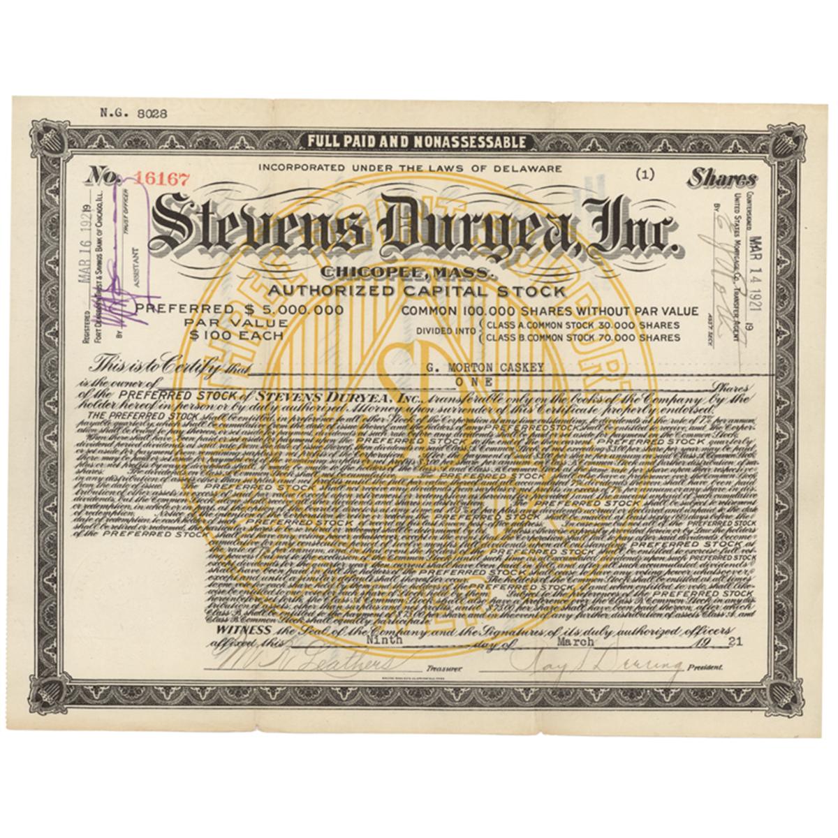 1921, Delaware. Stock certificate for one share. Black/White with Yellow underprint. Stevens-Duryea was an American manufacturer of automobiles in Chicopee Falls, Massachusetts between 1901 and 1915 and from 1919 to 1927. Slight splits at folds. Overall Fine.