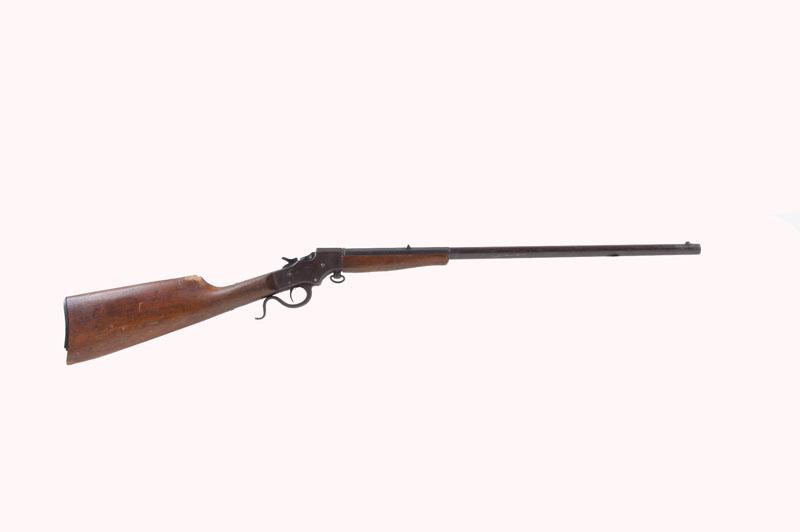 Stevens Favorite Cal .22LR SN:NVSN Early boys single shot lever action falling block rifle with take down feature. Blued barrel which is part octagonal, case color receiver, smooth wood straight grip stock and small smooth forearm, 22" barrel with fixedEarly boys single shot lever action falling block rifle with take down feature. Blued barrel which is part octagonal, case color receiver, smooth wood straight grip stock and small smooth forearm, 22" barrel with fixed sights, good bore andaction. Condition: Good to very good with some damage to stock at the toe and on top. Metal finish drifting to soft brown patina.