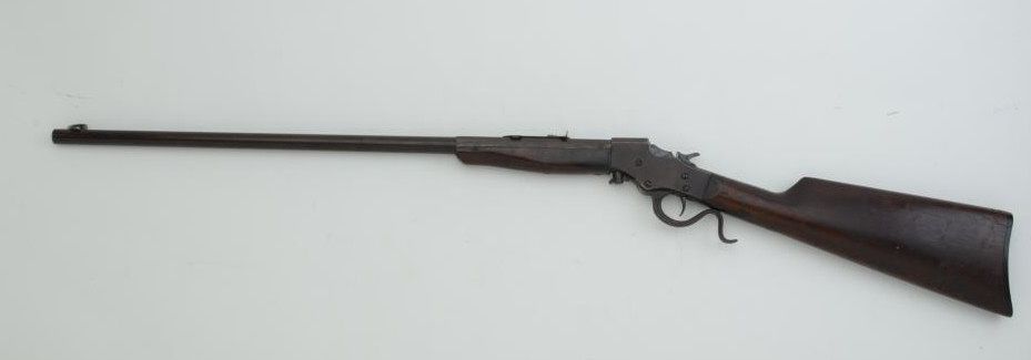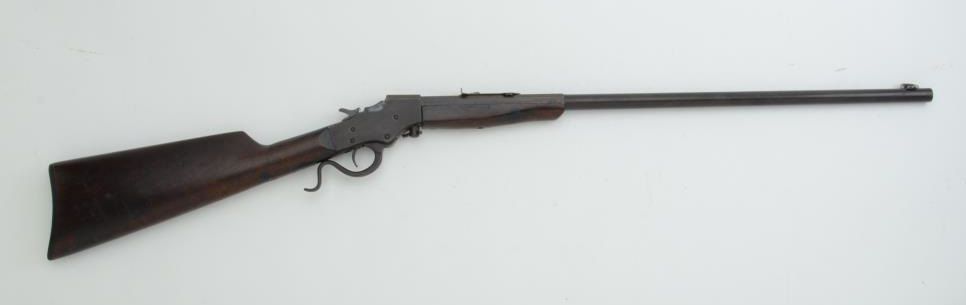 Stevens Favorite falling block single shot rifle, .22 cal., 24” barrel, wood stocks, #831 in overall good condition showing a brown patina on metal surfaces, very good bore, strong action, fair to good markings, good wood stocks with scattered mars and surface grime that should clean. Est.: $150-$300.
