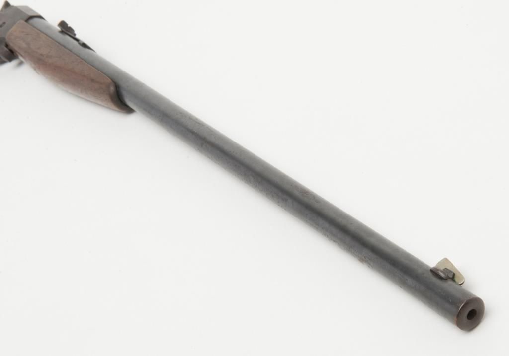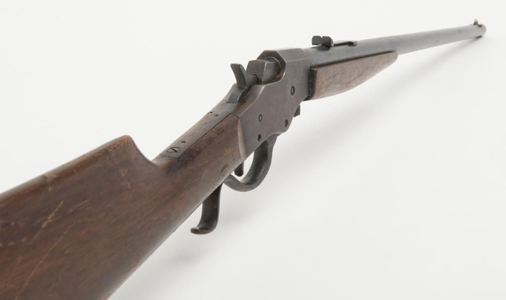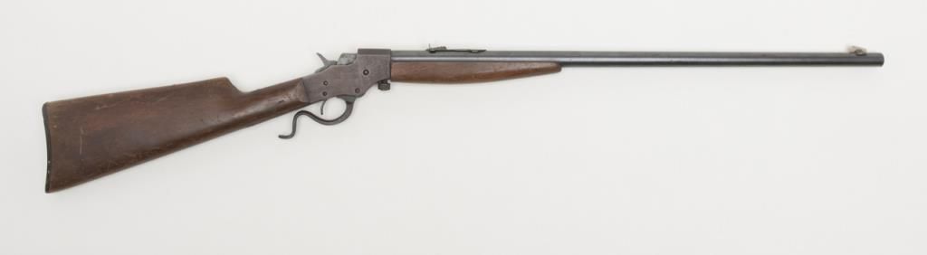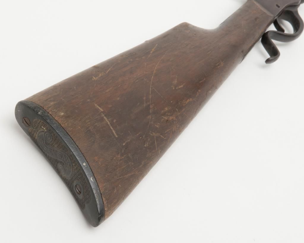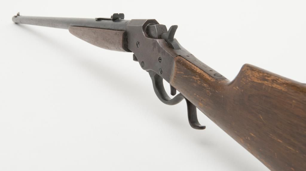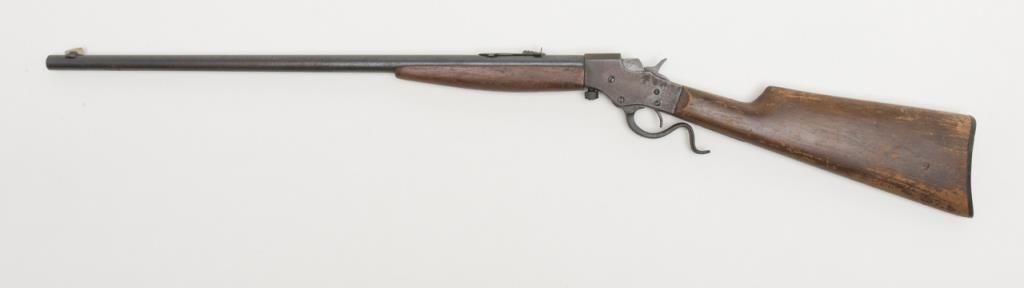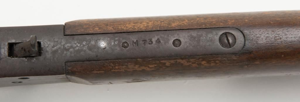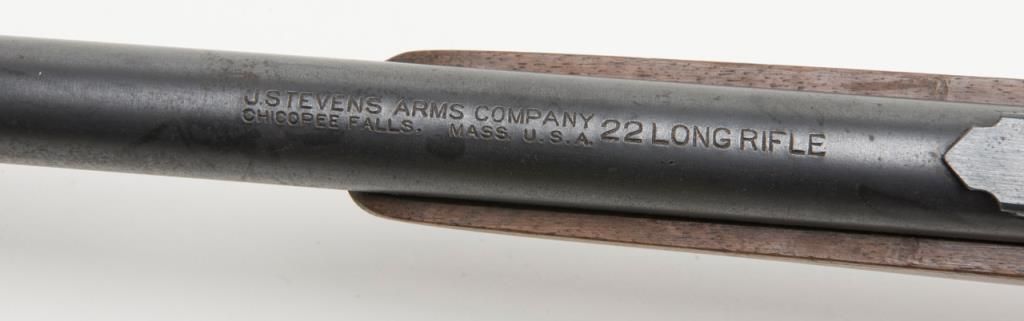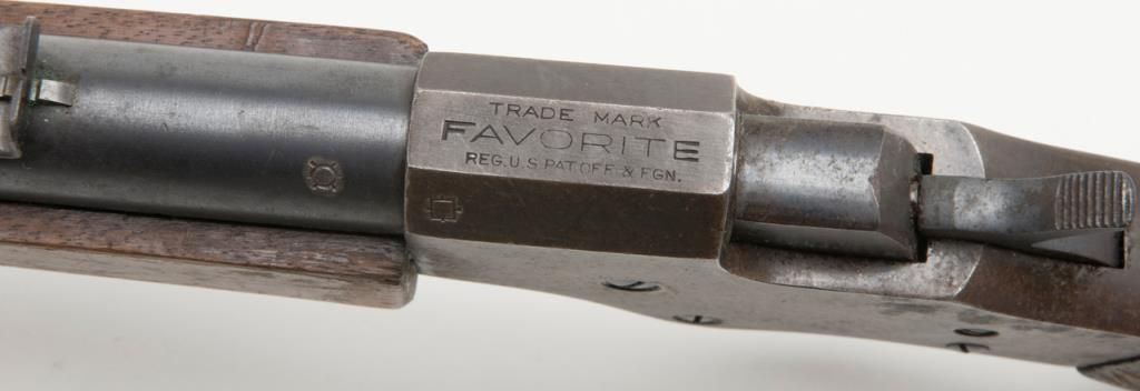 Stevens Favorite single shot takedown rifle, .22 Long Rifle caliber, Serial #M734. The rifle is in overall fair to good condition with 24” blued barrel, with adjustable rear and silver blade front sights. The barrel retains the majority ofits blued finish, while the action has gone primarily to patina. The smooth wood stocks are in good condition showing a loss of finish and considerable mars consistent with use. The bore is fair, action functions and markings are legible on this rifle. (C+R/PPT). Est.: $100-$200.
