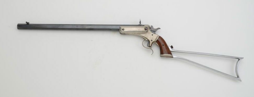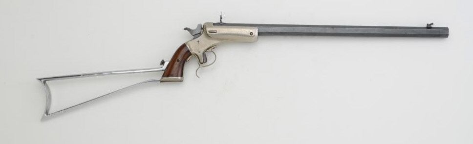 Stevens “Hunter’s Pet”, .32 Ideal cal., 18” octagon barrel (factory error marked “22 short or long rifle”), blue and nickel finish, rosewood grips, detachable skeleton shoulder stock with re-nickeled finish tostock, #4594. This gun is in overall very good condition showing considerable muted original blue finish on the barrel and likewise considerable original frosted nickel on the frame; very good to fine bore, crispaction, very good markings and very good to fine wood grips; adjustable flip-up rear sight and Beech’s flip-up front sight. Est.: $500-$1,000.