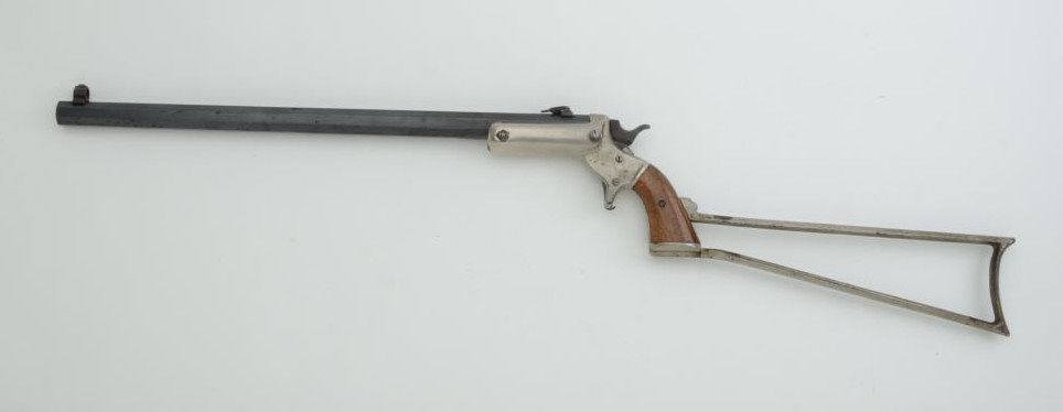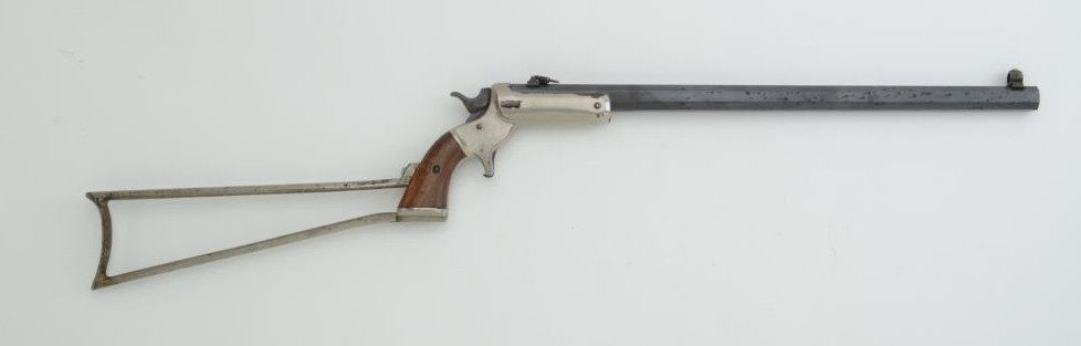 Stevens Hunter’s Pet single shot tip-up spur trigger rifle with skeleton shoulder stock, .38RF cal., 18-1/4” octagon barrel, blue finish to barrel, nickel finish to frame and shoulder stock, wood grips, #637. This gun is in overall very good condition showing the majority of its original muted blue finish on the barrel with some scattered spots of erosion, considerable original frosted nickel finish on frame with some flaking, alsoconsiderable original frosted nickel on skeleton stock with scattered losses that have gone to a dark patina, replaced attaching screw, good bore and markings, action working but trigger spring needsrepair, grips are good to very good; hooded front sight, flip-up rear sight. Est.: $600-$1,200.