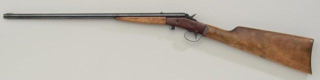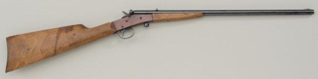 Stevens “Little Scout” single shot rifle, .22LR cal., 20” barrel, re-blued finish, wood stock, #NVSN. This gun is in overall good finish as re-finished; good bore and action, overall good wood with some staining. Est.: $50-$100.
