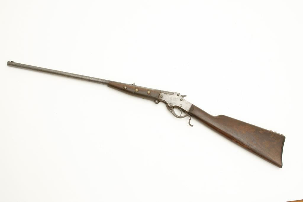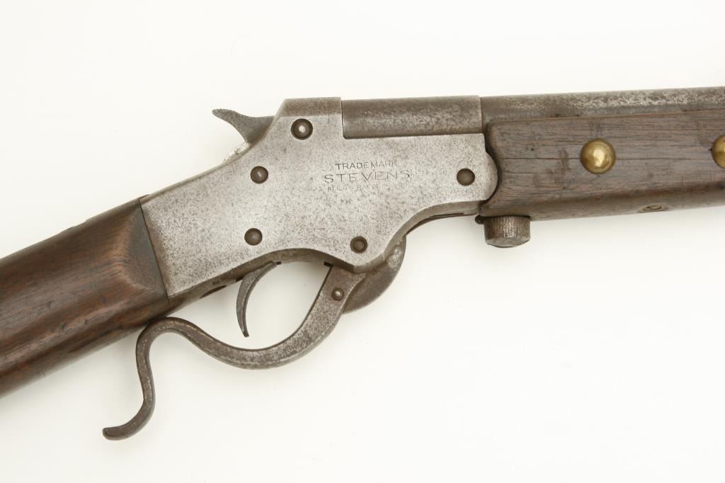 .22 Long Rifle caliber, serial #NSNV. The rifle is in fair overall condition with a 24” round barrel. The barrel has gone to a speckled, grey patina with light surface rust and moderate erosion noted. The receiver is grey with surface rust evident. The smooth wood stocks are in fair condition showing heavy use and finish loss with old brass tacks adorning the fore end and butt stock. The butt stock ends with a hard rubber, Stevens marked butt plate. The bore is fair, the action functions and the markings are legible. (Antique) Est.: $100-$200.