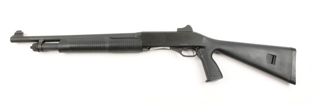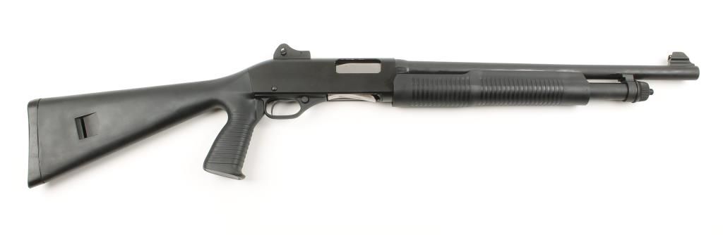 Pump action tactical shotgun with 18-1/2" barrel. Matte blue finish, black plastic butt stock with pistol grip and grooved pump handle, adjustable rear aperture sight and green high-viz front sight. Very good bore and action. Condition: Excellent.