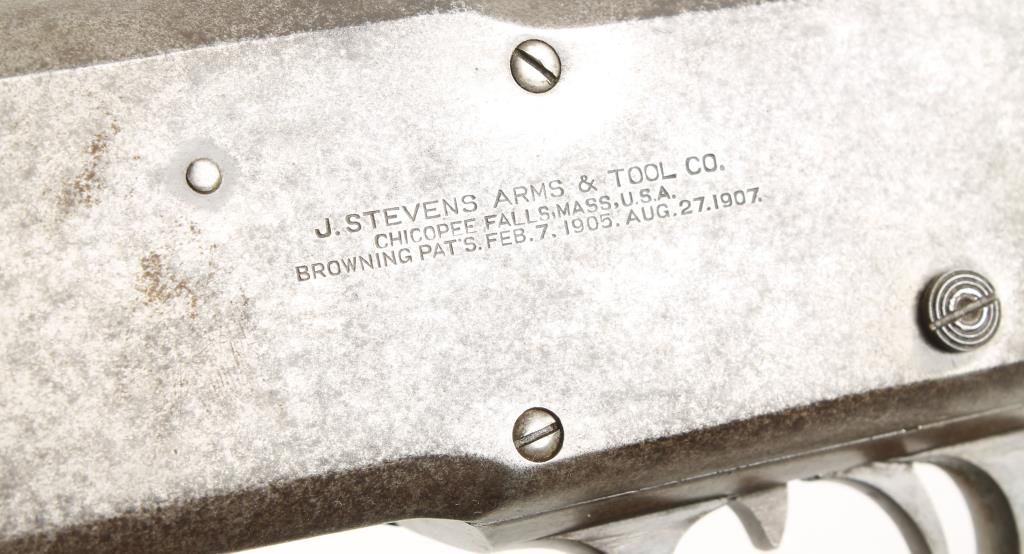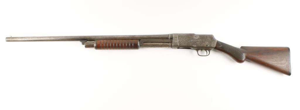 Early pump action utility grade shotgun with 27" barrel. Originally blued finish, round knob pistol grip walnut stock and grooved pump handle. Butt stock has been hand checkered by a previous owner. Very good bore and fair action as it is difficult to release at times. Condition: Fair as little finish remains and has graying patina. *Curio & Relic Firearm*