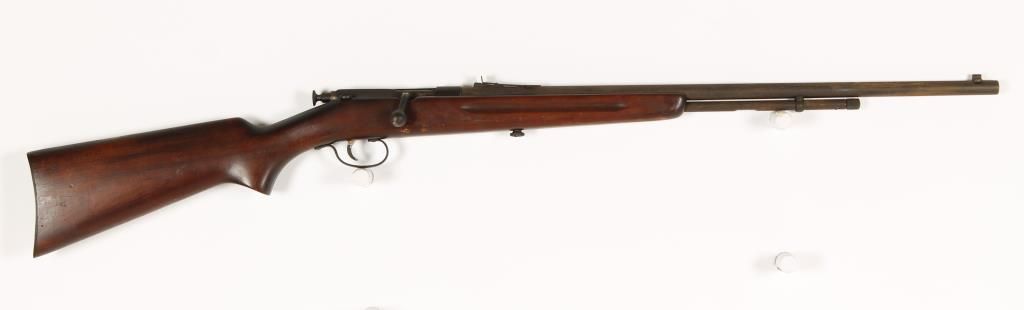 Bolt action rimfire rifle with 24" barrel. Blued finish, plain pistol grip wood stock, tube magazine and open sights. Dark bore and fair action. Condition: Poor to fair showing light pitting and corrosion throughout. *Curio & Relic Firearm*