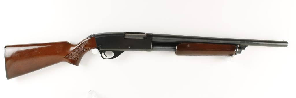 Pump action shotgun with 18-1/2" barrel. Blued finish, checkered pistol grip walnut stock, pump handle and tube magazine. Dark bore and good action. Condition: Fair to good showing good bluing and stock is cracked at top and bottom tang.
