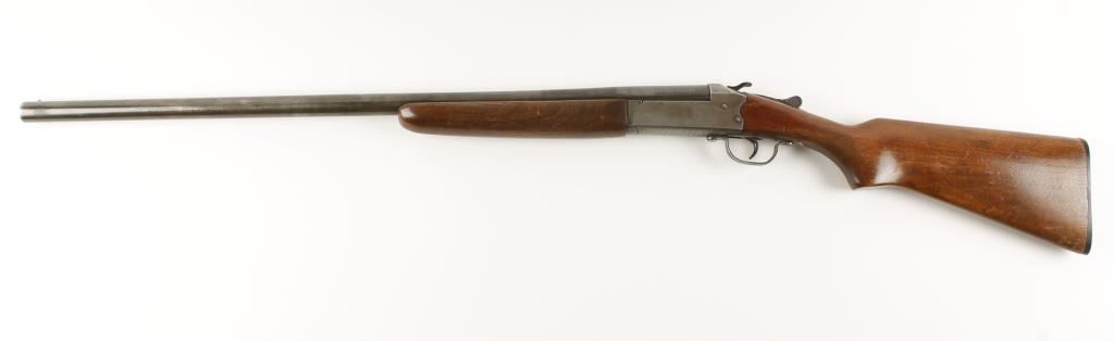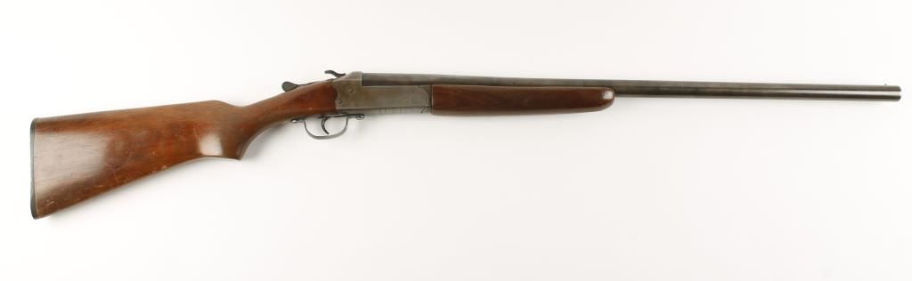 Single shot break action exposed hammer shotgun with 28" barrel. Blued finish, plain straight grip wood stock and forend and black plastic butt plate. Good bore and action. Condition: Good overall showing graying patina and wood is good. *Curio & Relic Firearm*