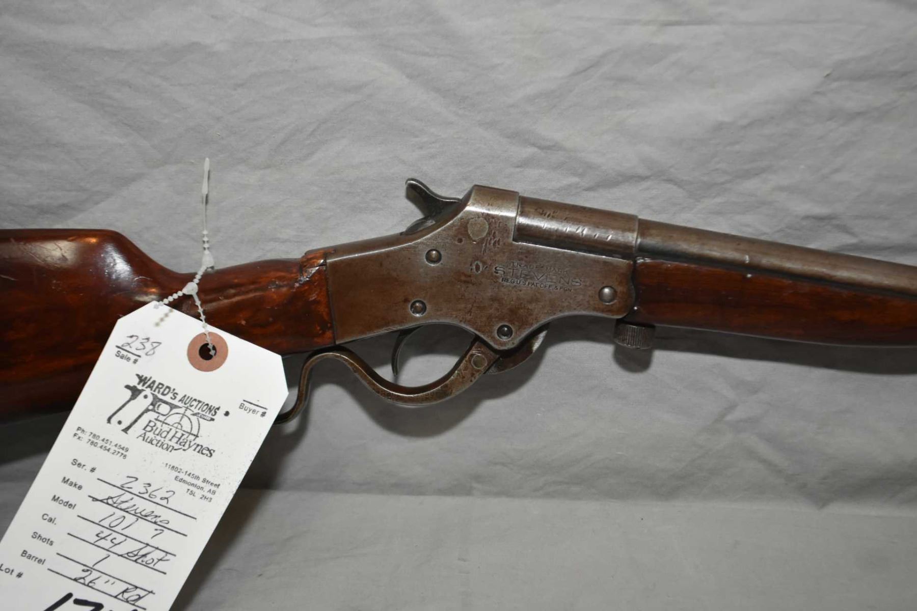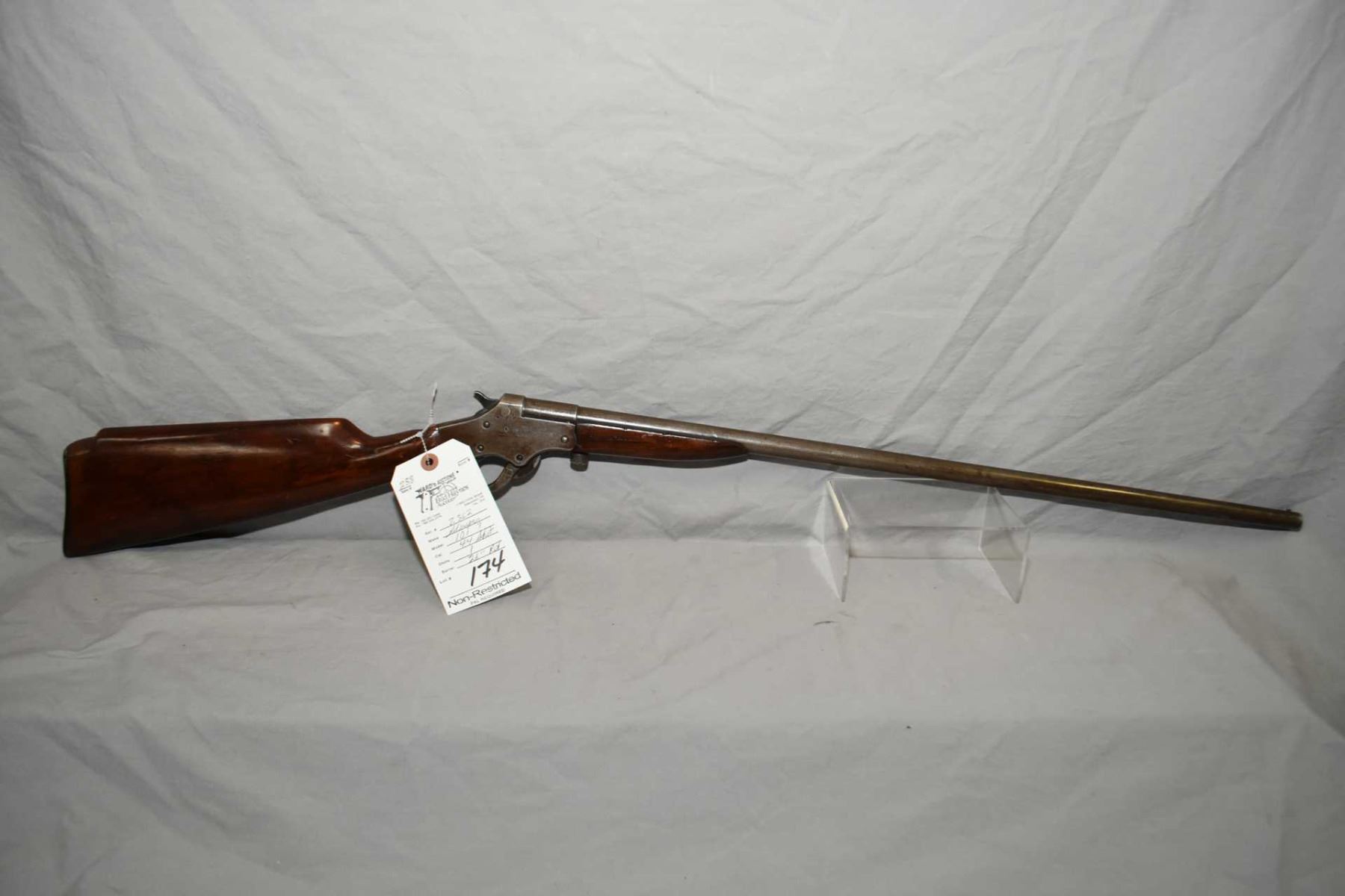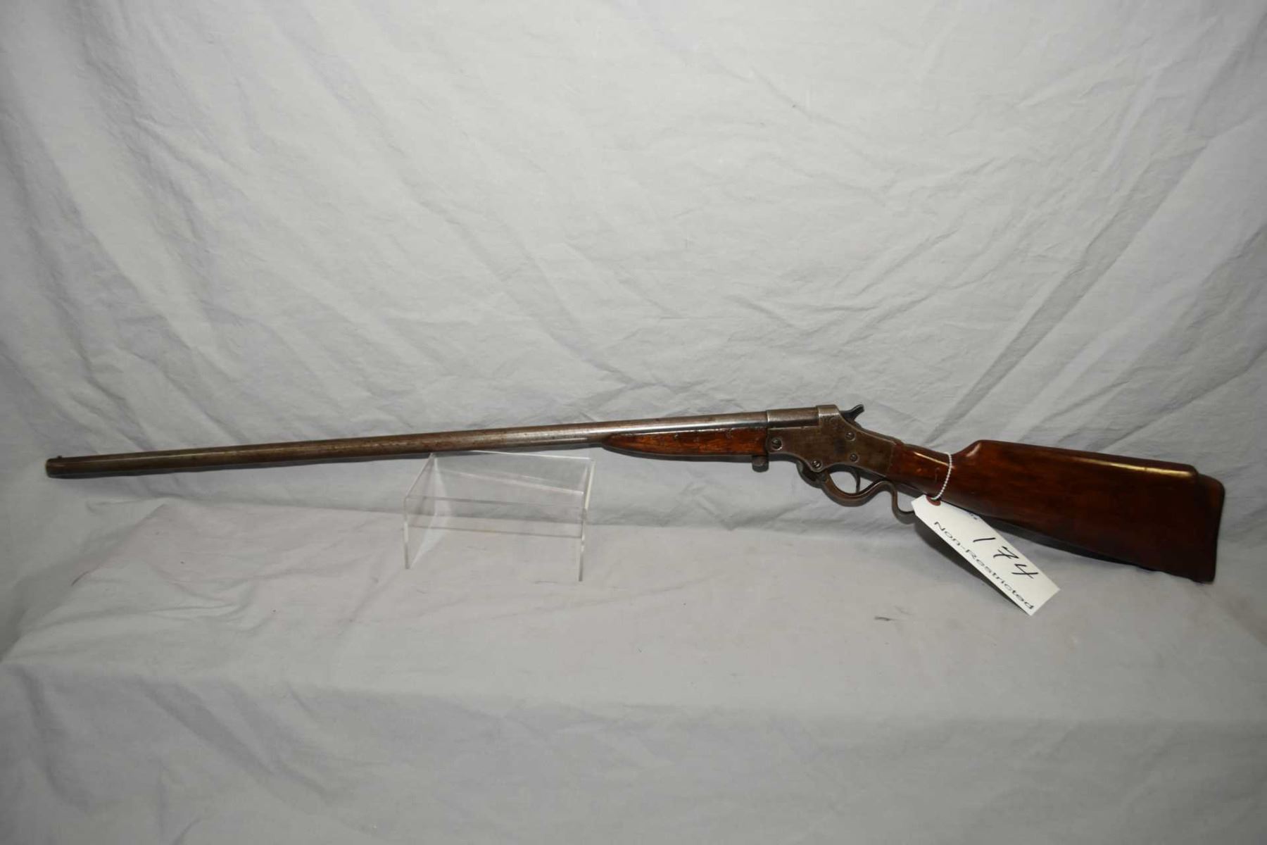 Stevens Model 101 ? .44 Shot Cal Single Shot Rifle w/ 26" rnd bbl [ traces of blued finish turned brown, fading to grey in most areas, butt stock with small comb, with checkered black butt plate, missing small piece, wrist appears sanded down by upper tang, revarnished wood including forend, some marks ] Ser # Z362