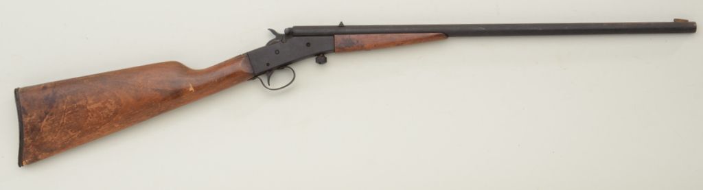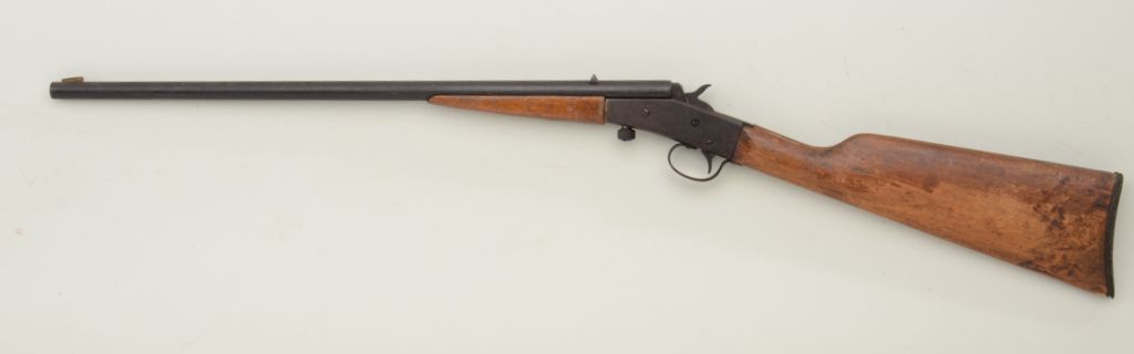 Stevens Model 14-1/2 single shot rifle, .22 cal., 20” round barrel, wood stocks, #NVSN. This gun is in well-used condition showing a heavy dark patina on metal surfaces, fair bore, good action, butt stock is cracked attop of wrist; a good project gun. Est.: $25-$50.