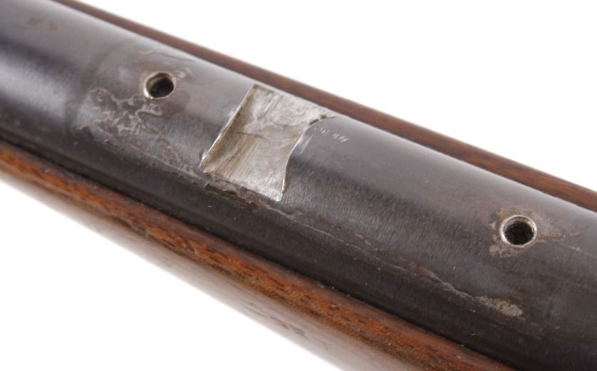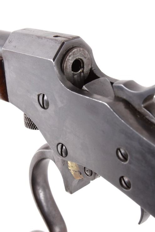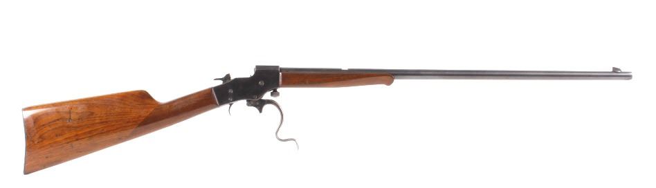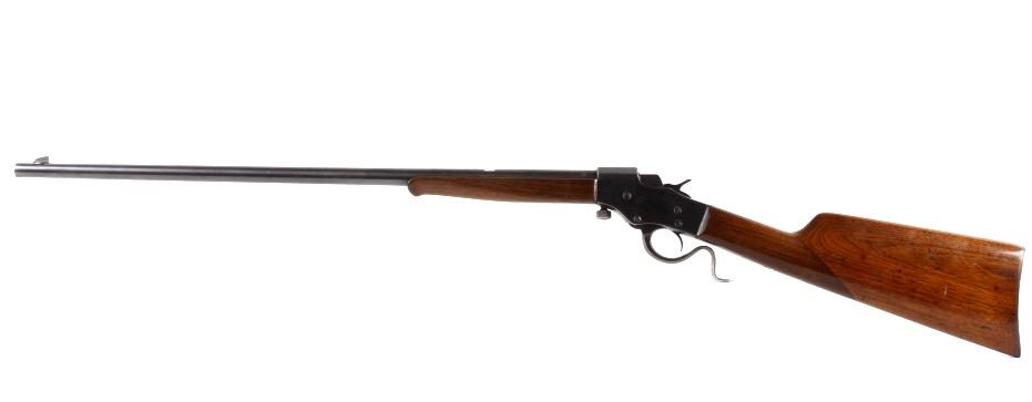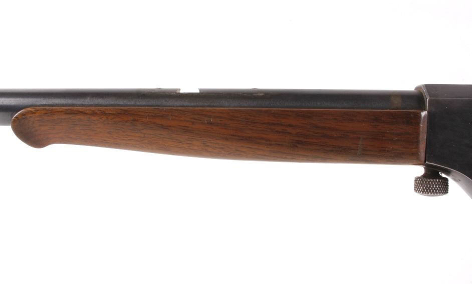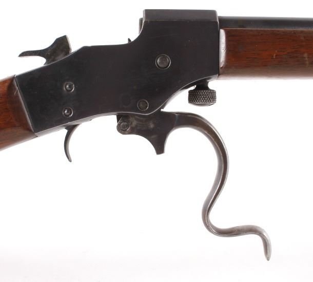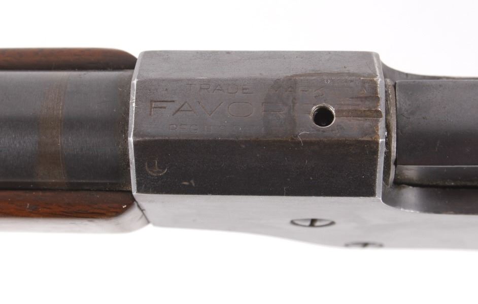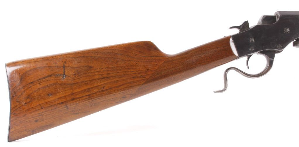 For bidding in this lot is a Stevens Model 1915 Favorite Rifle, with a falling block (pivot-block), lever action. The Stevens Model 1915 dates between 1915, and 1935. The Stevens products were manufactured with an "SVG" logo after 1928, dating this particular firearm to 1915 and 1928. The rifle is chambered in .22 and features a blue'd 22 3/4" full-round barrel, and blue'd receiver, and butt plate. Additionally, the rifle utilizes a gorgeous walnut stock. The rifle is marked in multiple spots, reading; "Trade Mark - Favorite - REG U.S. PAT. OFF..." on the top of the receiver, "Model 1915" on the upper-tang, serial number "D647" on the lower-tang, and a proof mark with a "1" inside of a circle, on the on the top left of the receiver. Overall, the rifle shows good condition, with strong blueing, and a bright bore, with good rifling. The rifle has some slight wear indicative of age. The action shows good condition, with play. The rifle has been drilled and tapped for a scope, and is absent of its rear fixed sight. The rifle dates between 1915 - 1927, and qualifies as Curio & Relic. FFL Transfer or NICS background check required. Serial Number: D647.