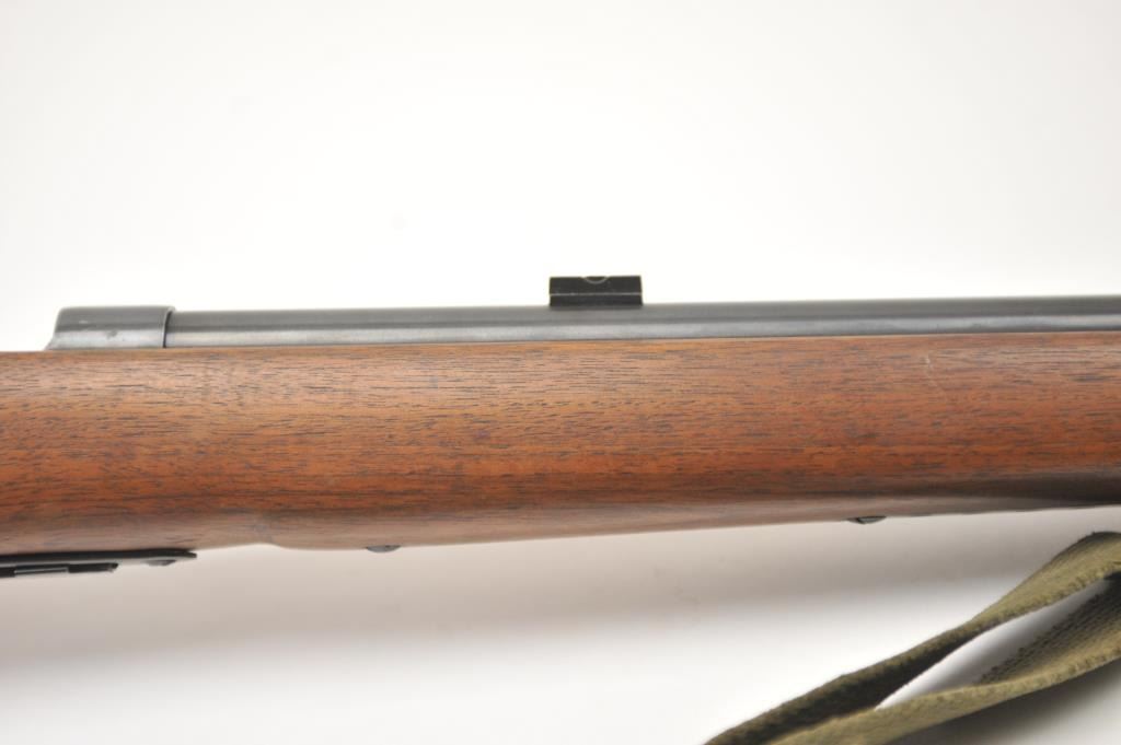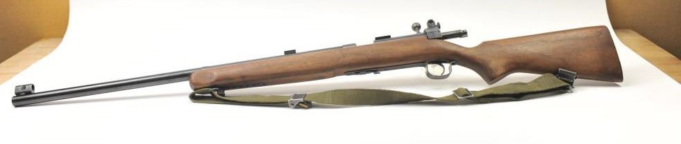 Stevens Model 416 U.S. marked bolt action target rifle, .22 Long Rifle caliber, Serial #207305. The rifle is in fine overall condition with a 26” heavy barrel with a globe style front sight and the rear dovetail filled. Scope blocks have been added during the period of use. The rifle retains nearly all of the blue finish and is marked, “U.S. PROPERTY” with the flaming bomb emblem on the receiver. A period aperture sight has been added during the period of use. The smooth wood target stock is in very good condition with small mars from field use and a canvas sling has been added. The bore is good, the action is crisp and the markingsare sharp. The lot includes one correct magazine. Est.: $200-$400. (C+R).